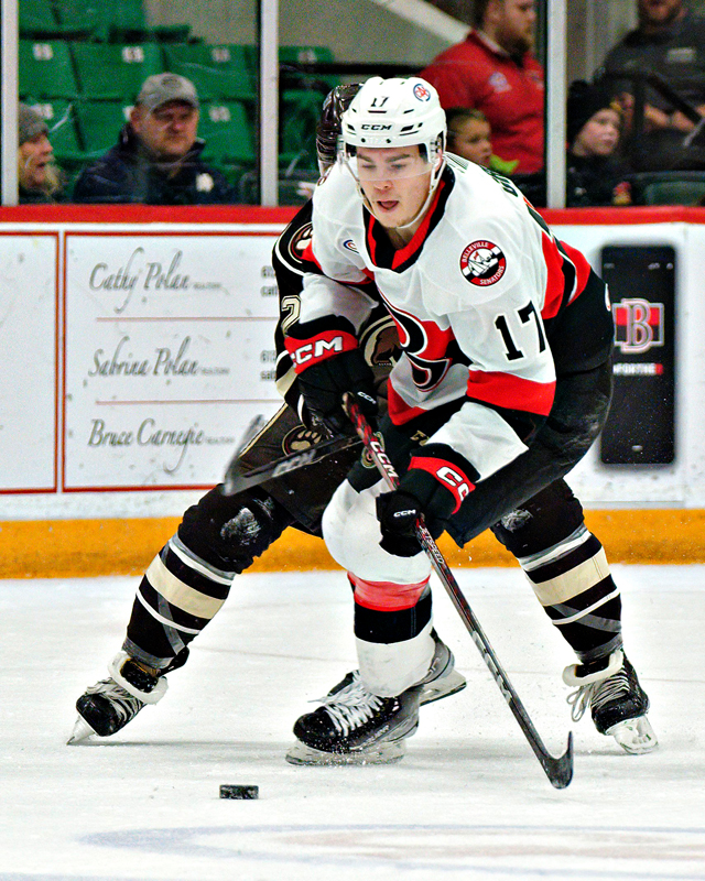 The Belleville Senators hosted the Hershey Bears on Saturday January 21st, 2023. Ridley Greig (17) of the Senators getting set to shoot on net. (Photo Credit: John Warren / ProHockeyNews)