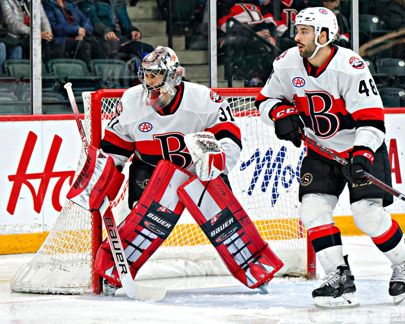 The Belleville Senators hosted the Hershey Bears on Saturday January 21st, 2023. Jonathan Aspirot (48) of the Senators helping his net minder Kevin Mandolese (31) of the Senators keep an eye on the puck. (Photo Credit: John Warren / ProHockeyNews)