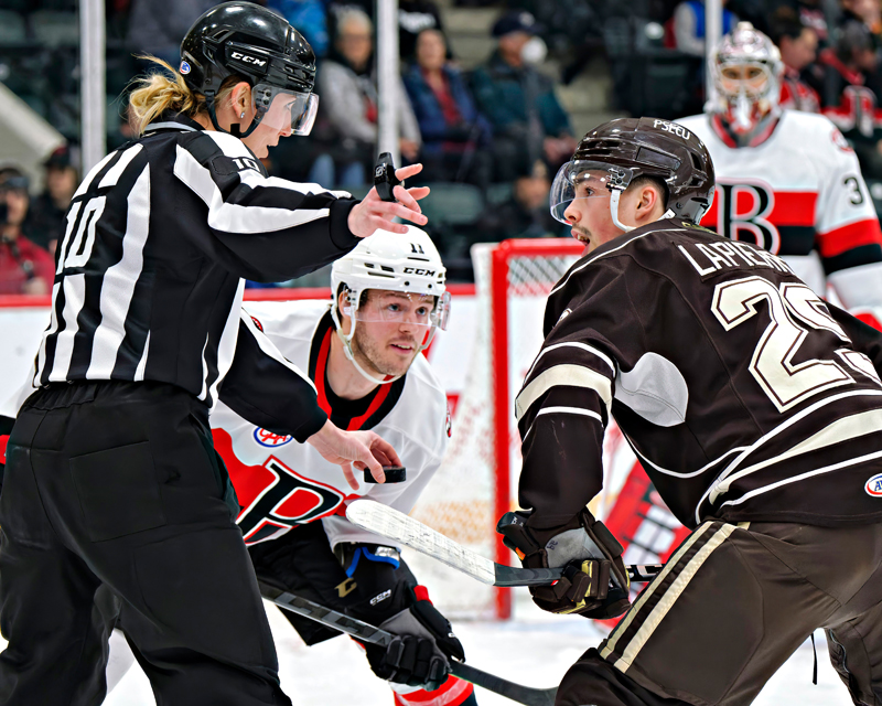 The Belleville Senators hosted the Hershey Bears on Saturday January 21st, 2023. Kyle Betts (11) of the Senators watching Hendrix Lapierre (29) of the Bears questions Linesman: Kirsten Welsh about being tossed out of the face off circle. (Photo Credit: John Warren / ProHockeyNews)