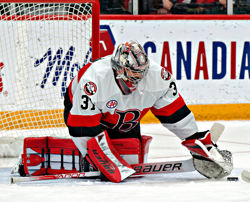 The Belleville Senators hosted the Hershey Bears on Saturday January 21st, 2023. Kevin Mandolese (31) of the Senators makes an easy save in the second period. (Photo Credit: John Warren / ProHockeyNews)