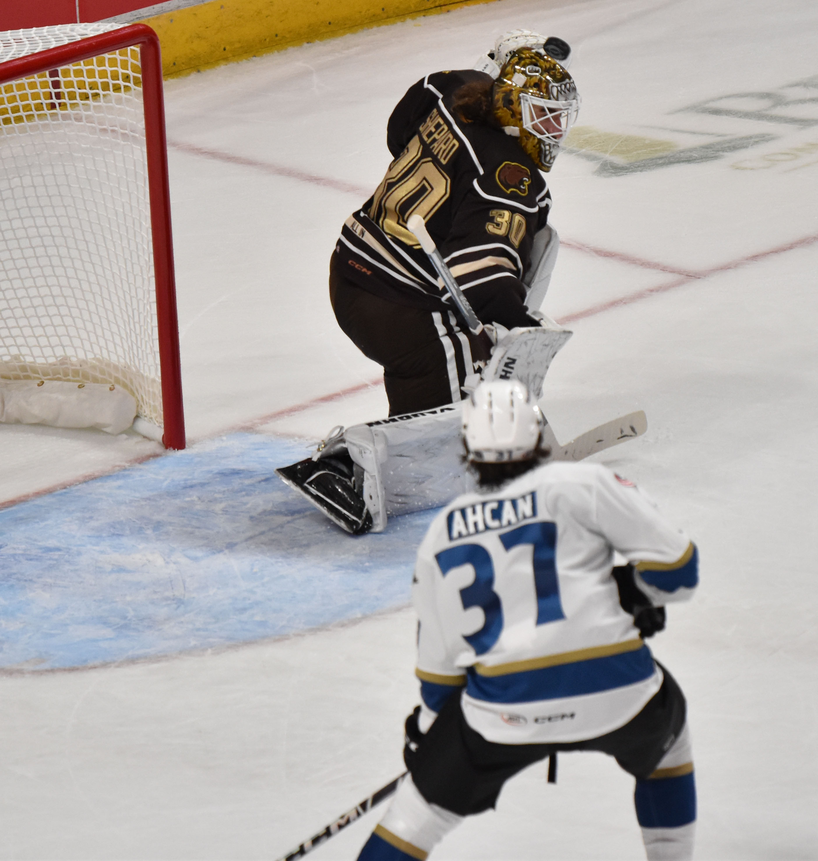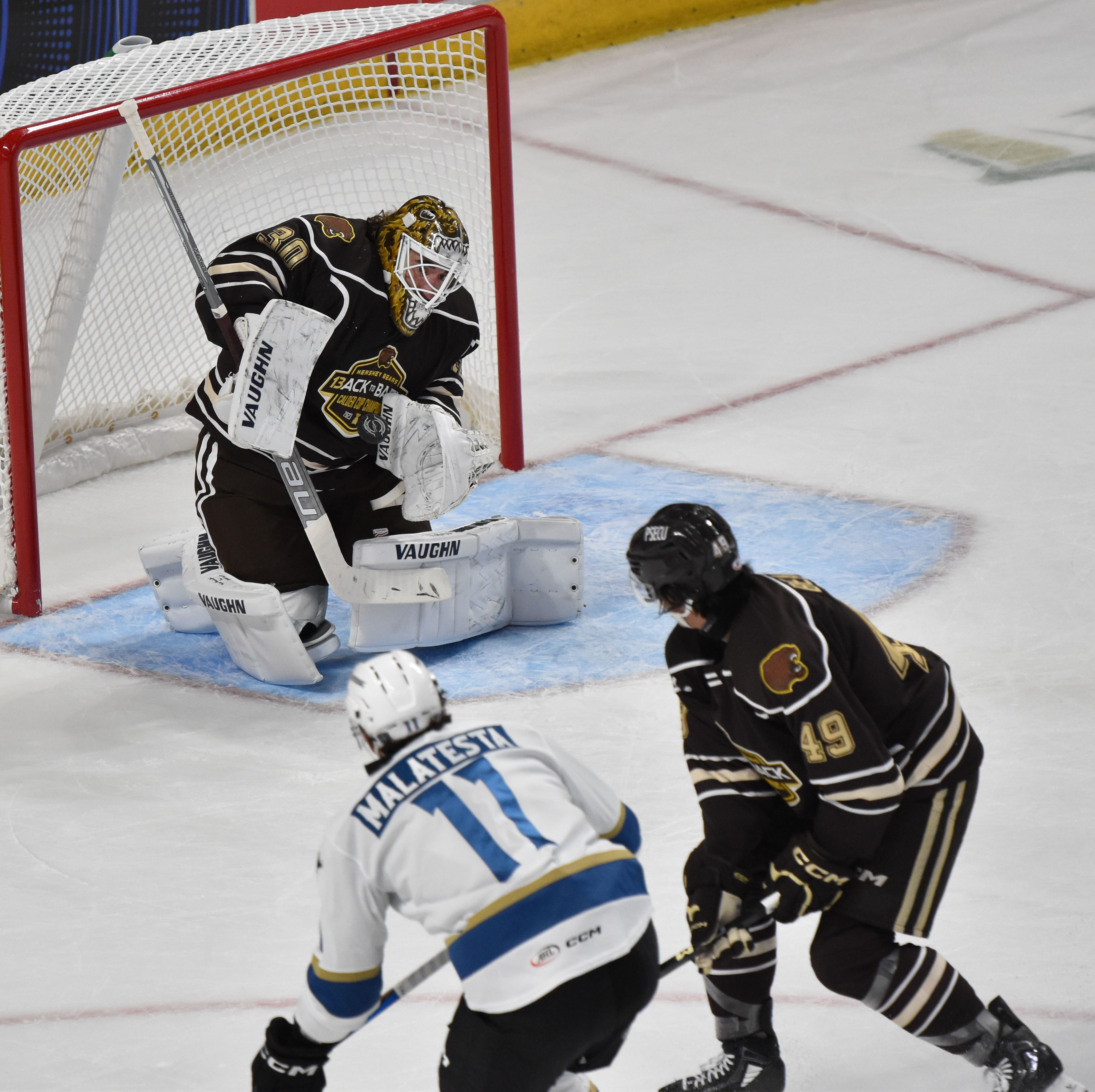 Cleveland’s Jet Greaves made 24 saves in defeat while Hershey’s Hunter Shepard made 28 saves for the win.