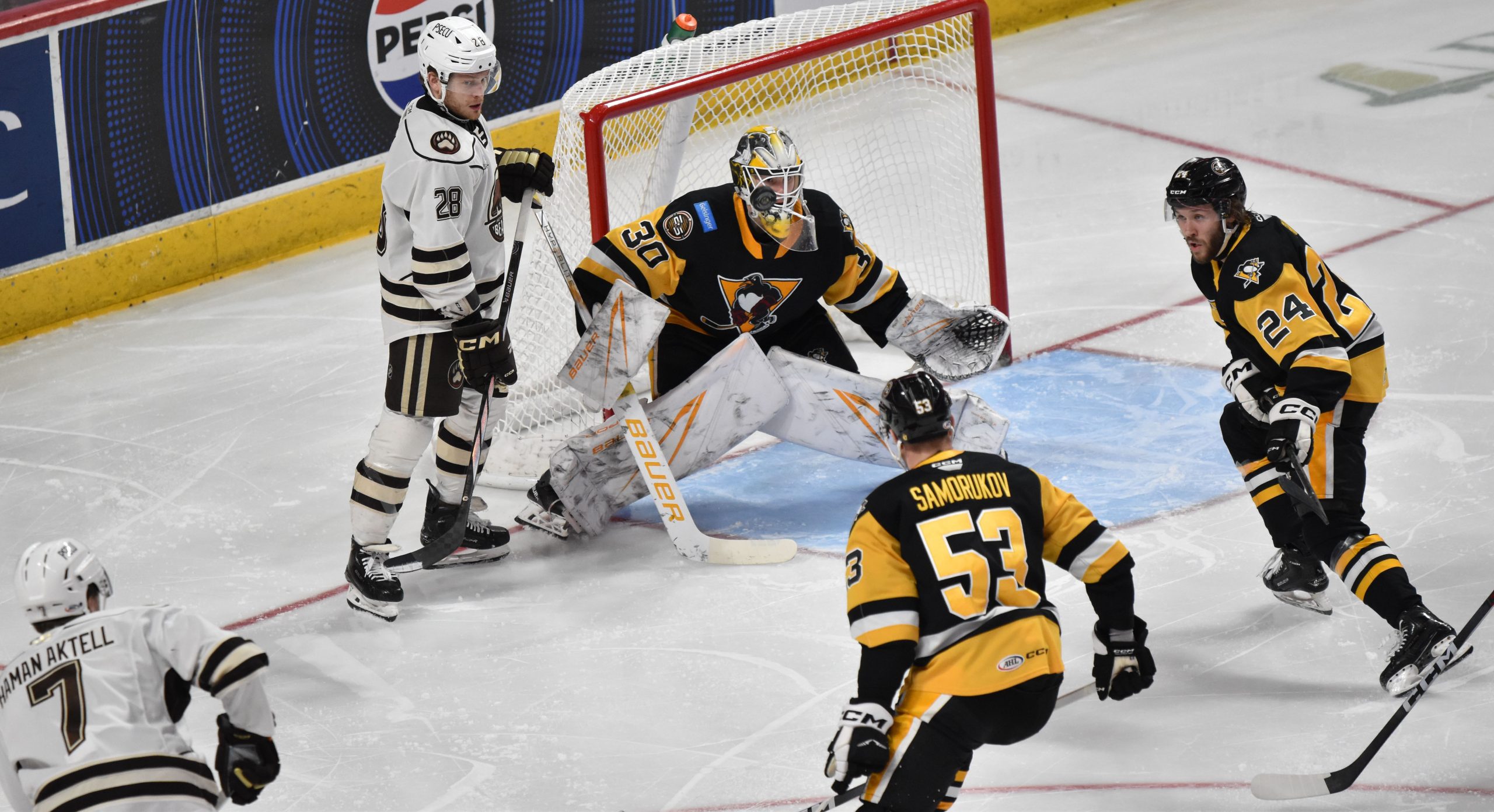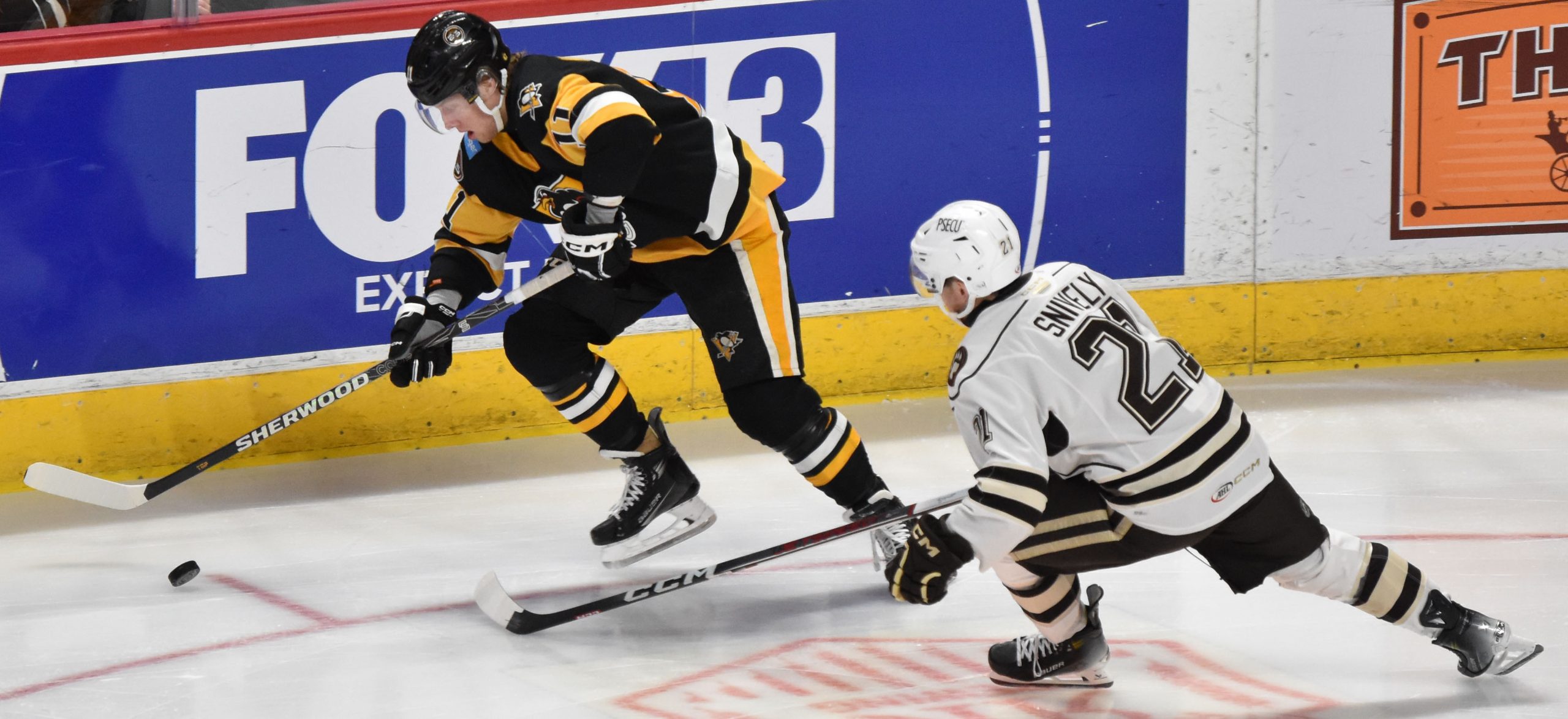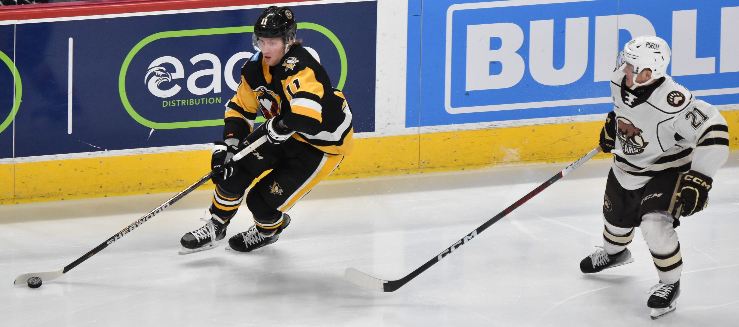 The Bears opened the scoring midway through the second period, when penalties to the Penguins at 11:27 and 12:16 put Hershey on a 5-on-3 man advantage. Ethen Frank received a pass from Mike Sgarbossa at the right side of the net and shoveled a backhand shot past Joel Blomqvist at 13:10 for his 17th of the season. The goal was also Frank’s ninth on the power play, moving him into a tie for first in the AHL with Ontario’s Samuel Fagemo.