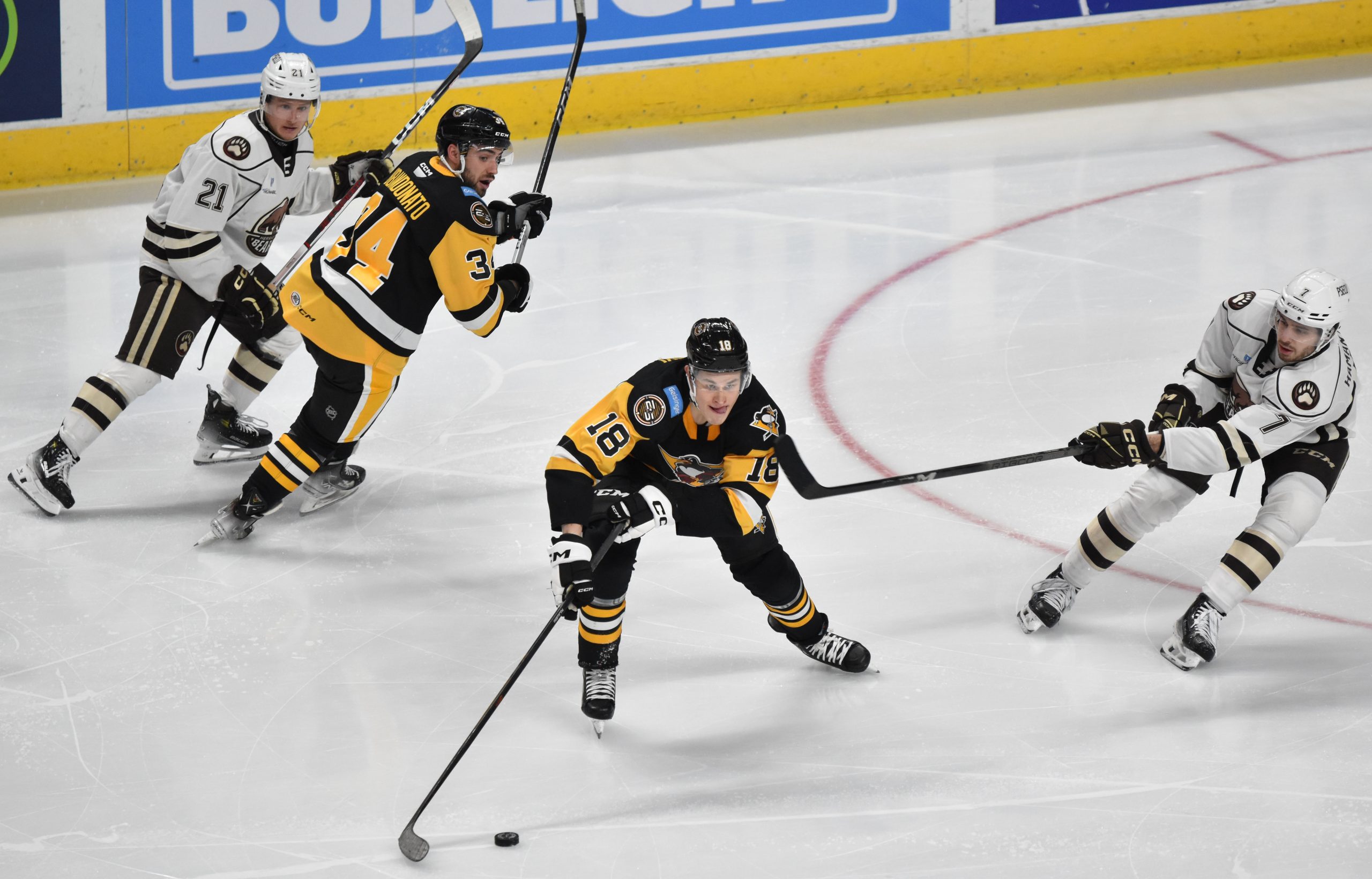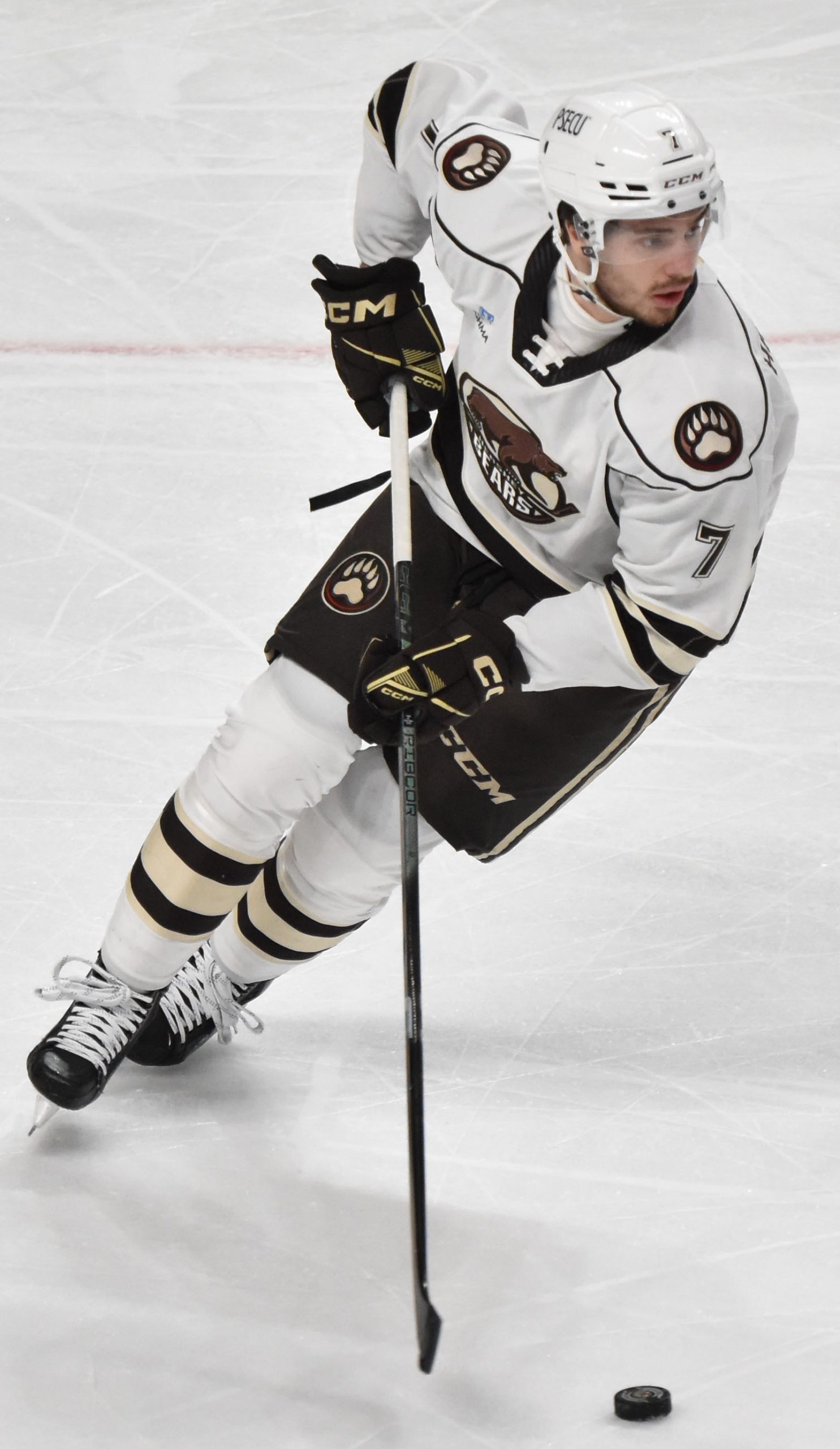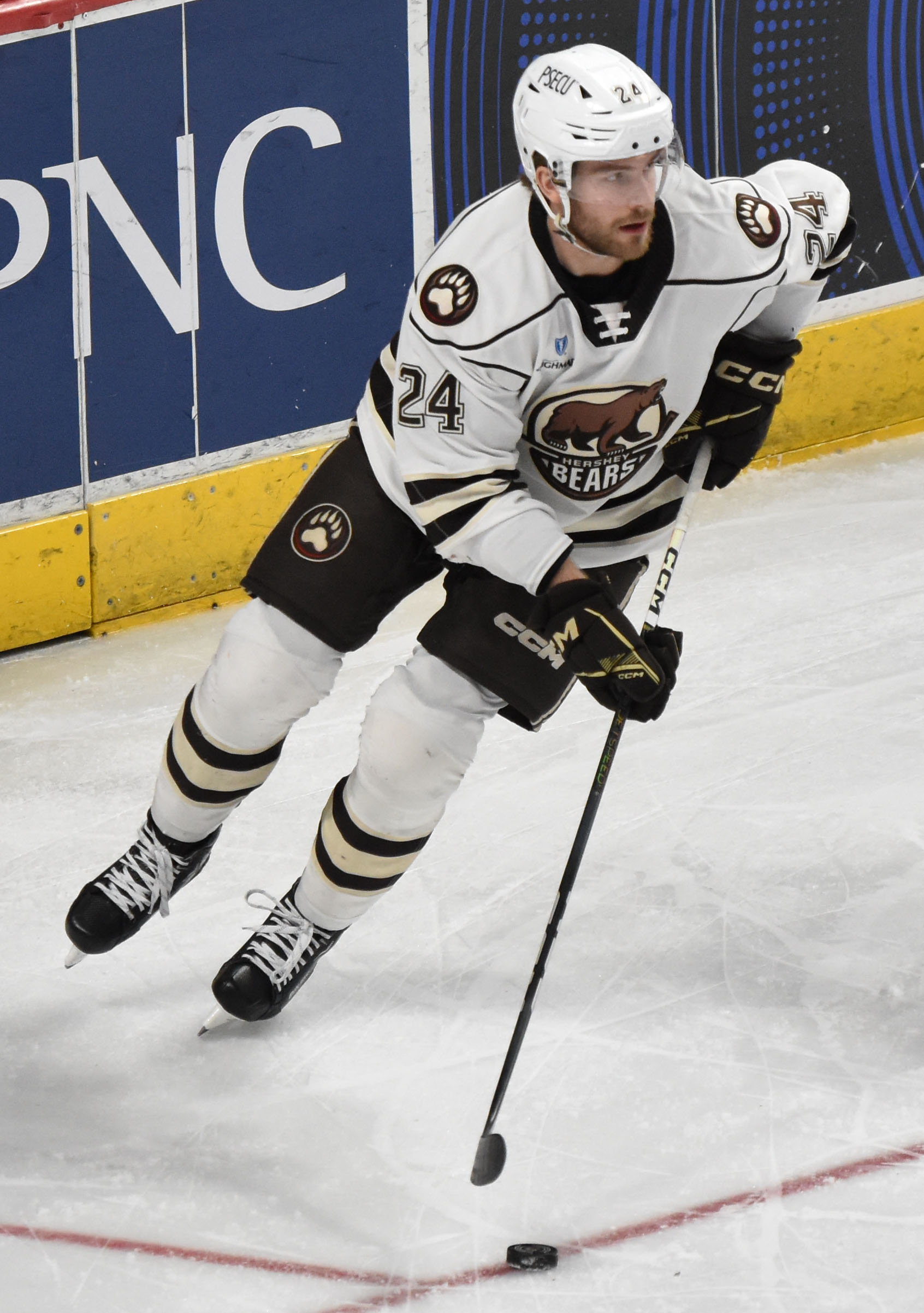 The Bears opened the scoring midway through the second period, when penalties to the Penguins at 11:27 and 12:16 put Hershey on a 5-on-3 man advantage. Ethen Frank received a pass from Mike Sgarbossa at the right side of the net and shoveled a backhand shot past Joel Blomqvist at 13:10 for his 17th of the season. The goal was also Frank’s ninth on the power play, moving him into a tie for first in the AHL with Ontario’s Samuel Fagemo.
