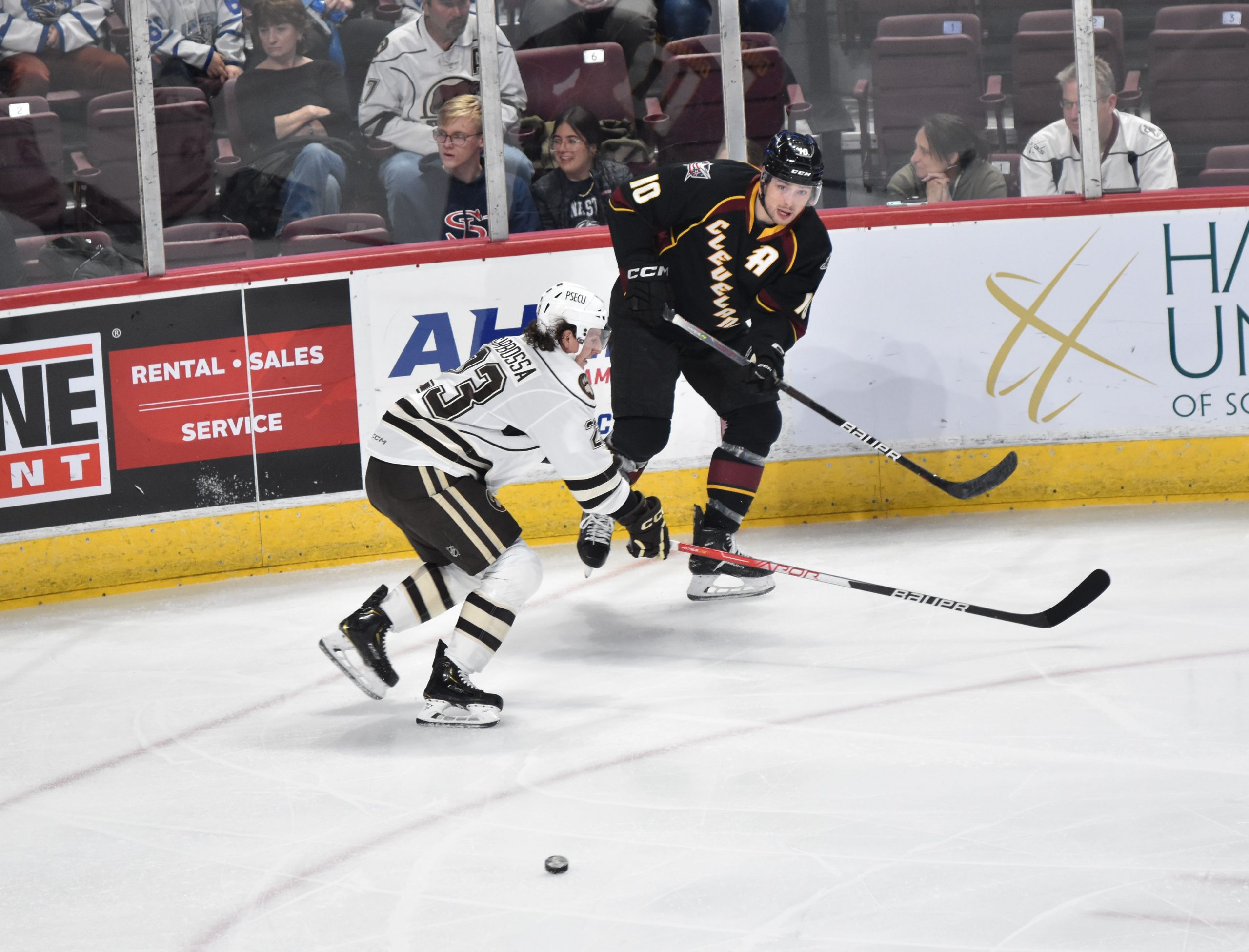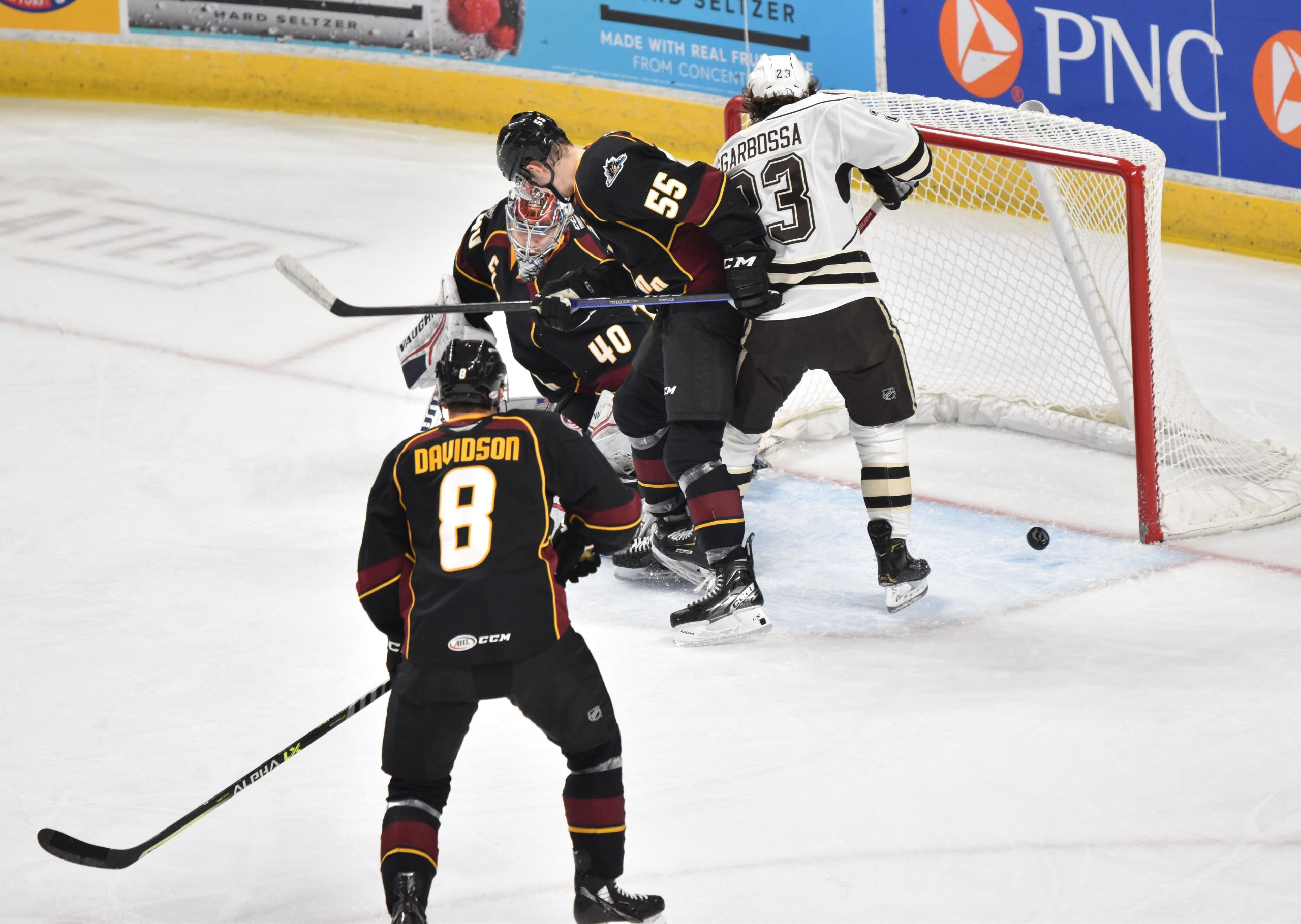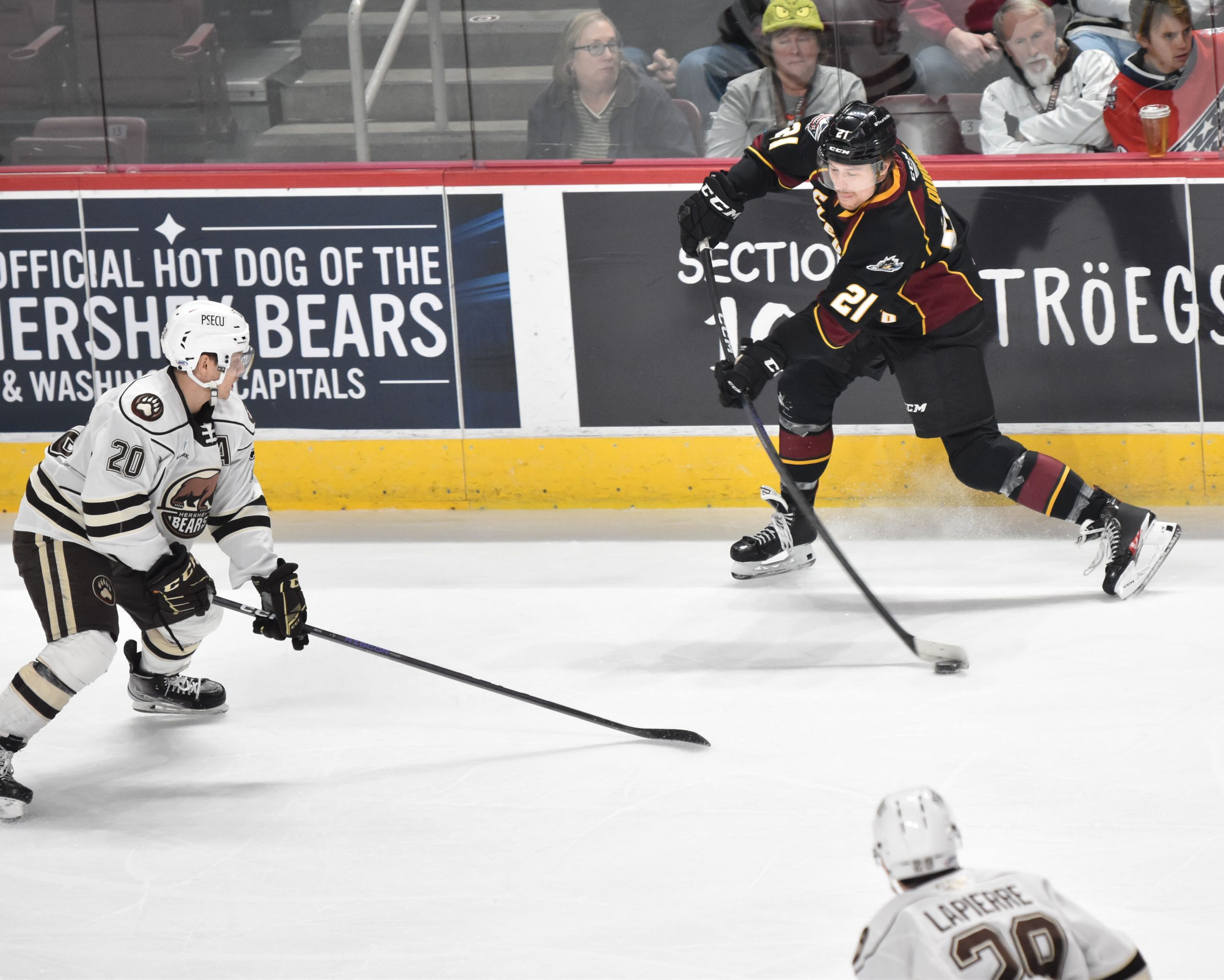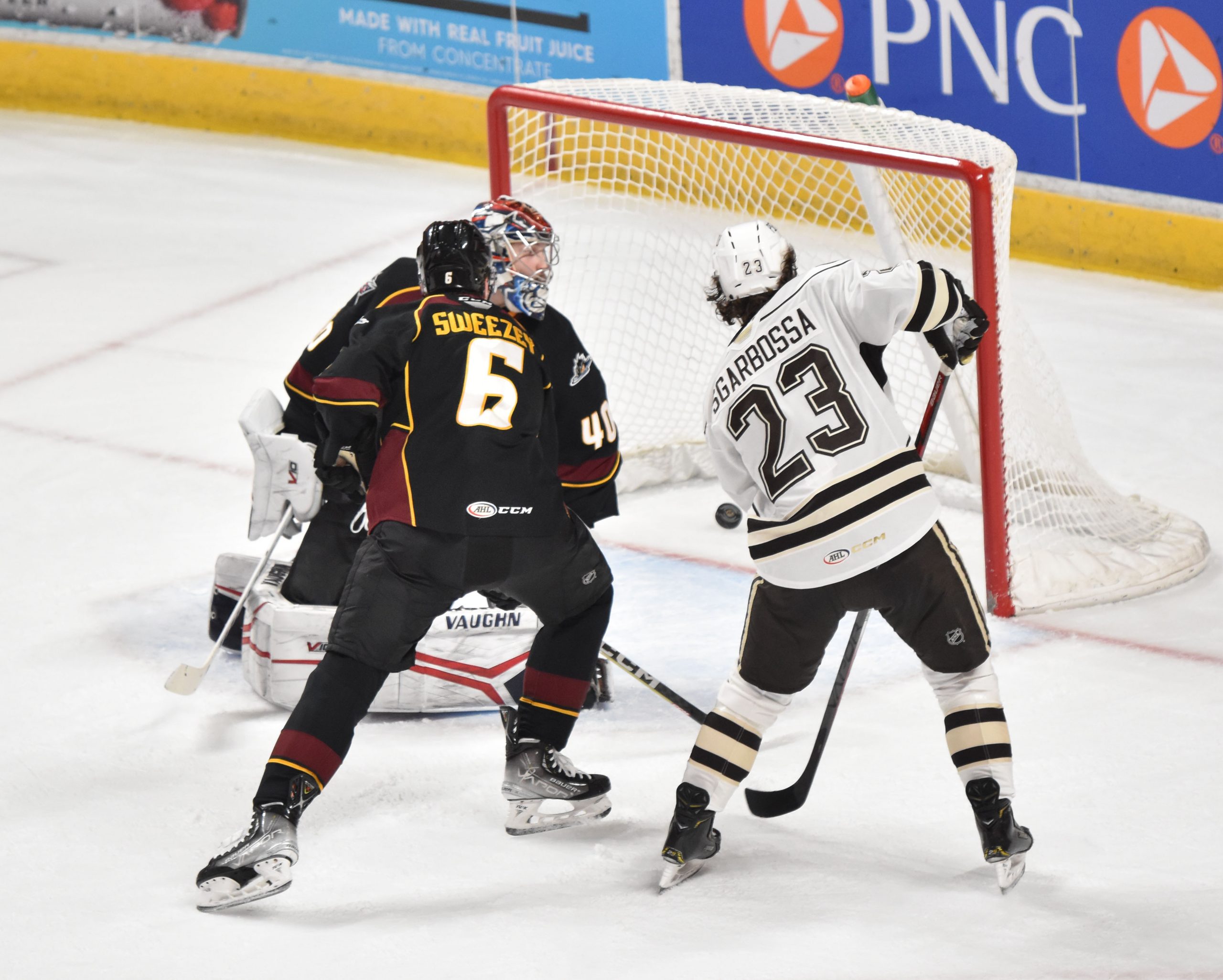 Mike Sgarbossa drew the Chocolate and White level with his seventh of the season at 8:59 when he used his skate at the side of the net to redirect a shot from the top of the left circle by Mason Morelli past Daniil Tarasov to make it 1-1. Bobby Nardella earned a secondary assist on the goal, his 100th career pro point.