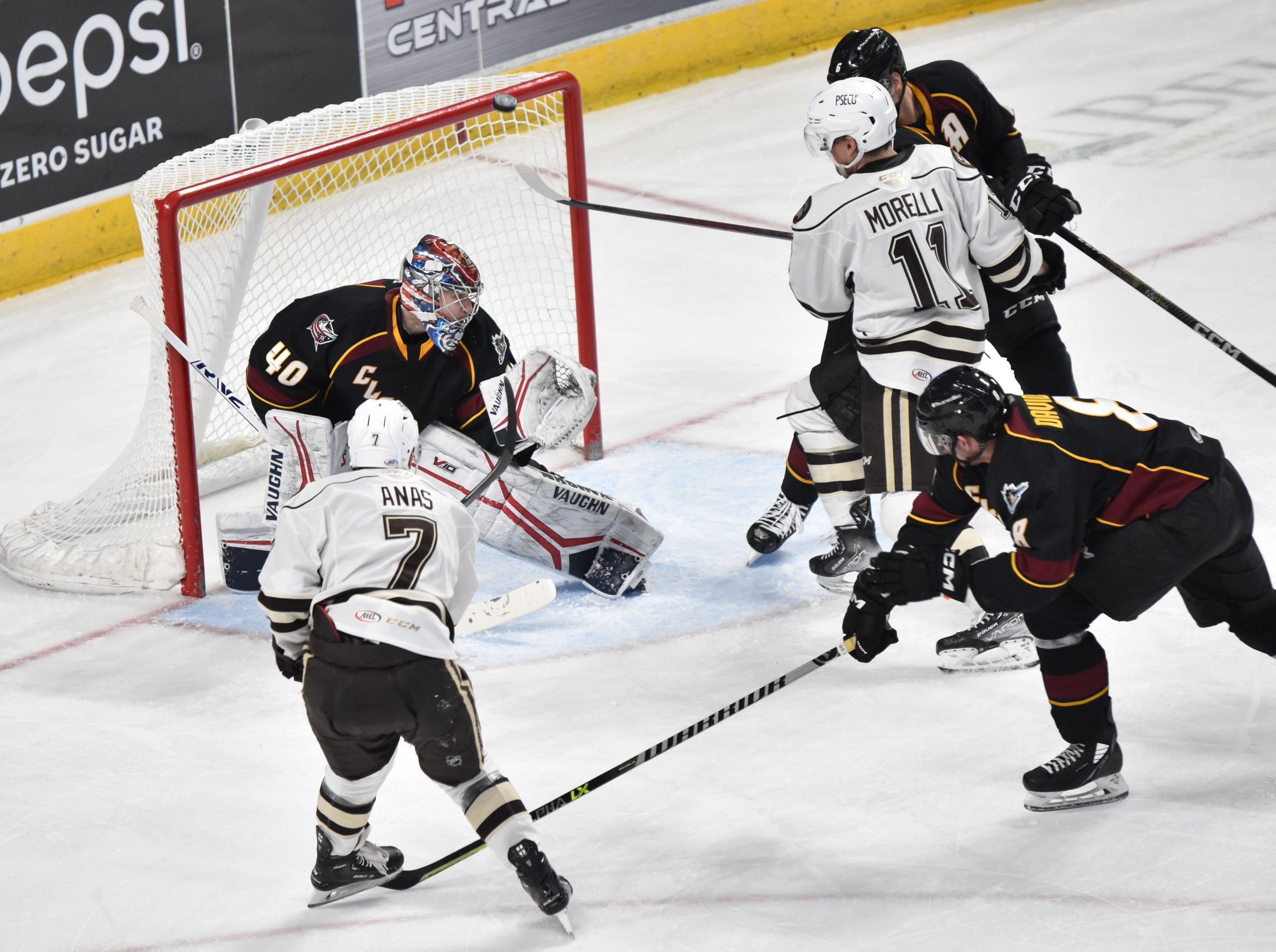 Following a second period in which neither club lit the lamp, the deciding goal ultimately came at 8:47 of the third when Sam Anas’ shot from between the circles appeared to ripple the net, but no immediate stoppage occurred before a whistle brought play to a halt at 11:25. A video review conducted by the officials confirmed that Anas’ shot had beaten Tarasov above the glove and fully entered the net, putting Hershey ahead 3-2. The game-winning tally was Anas’ seventh of the season, with Morelli and Connor McMichael receiving assists.