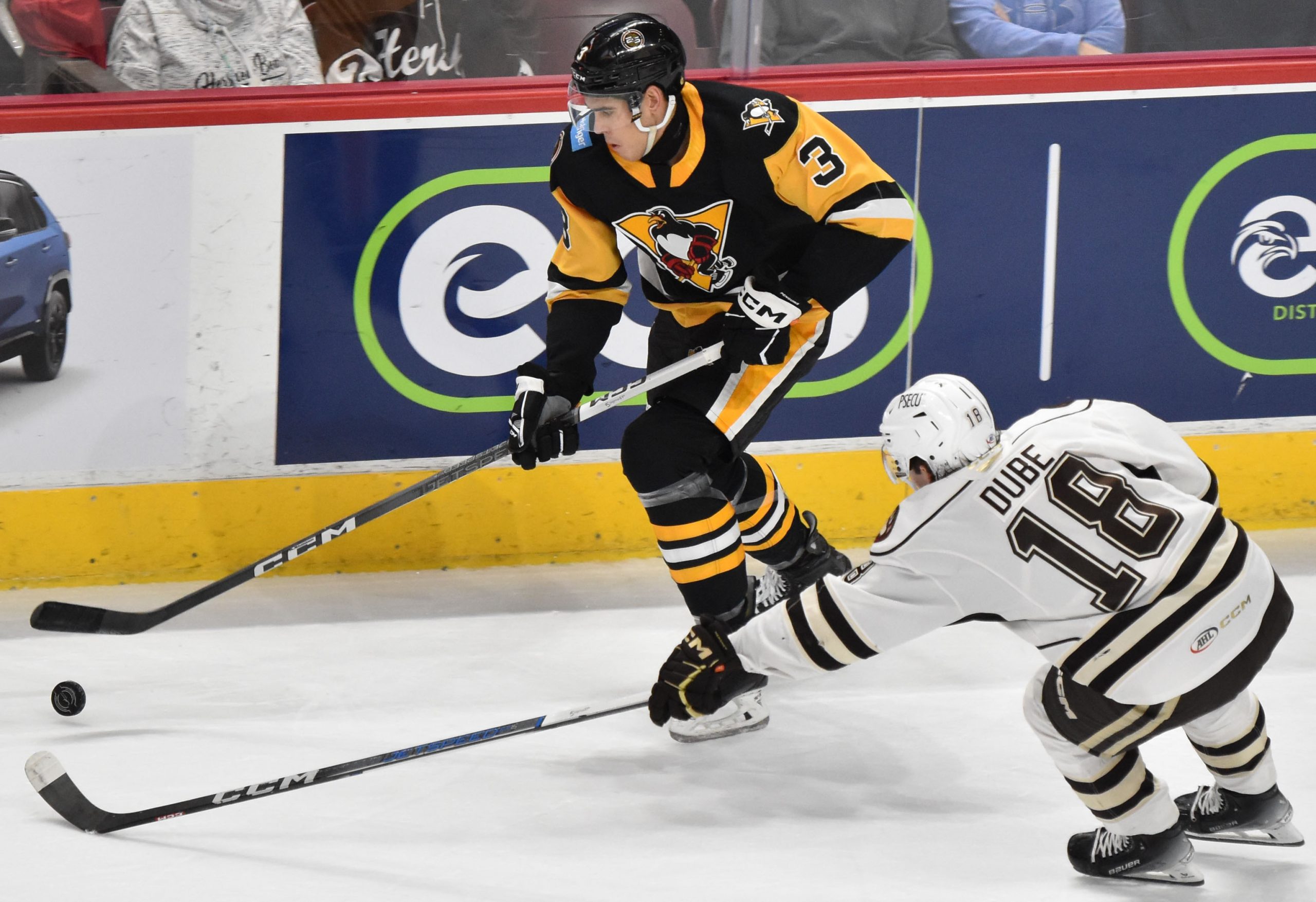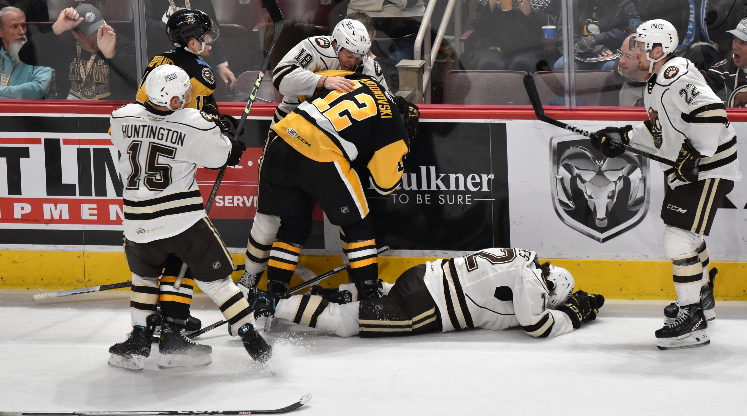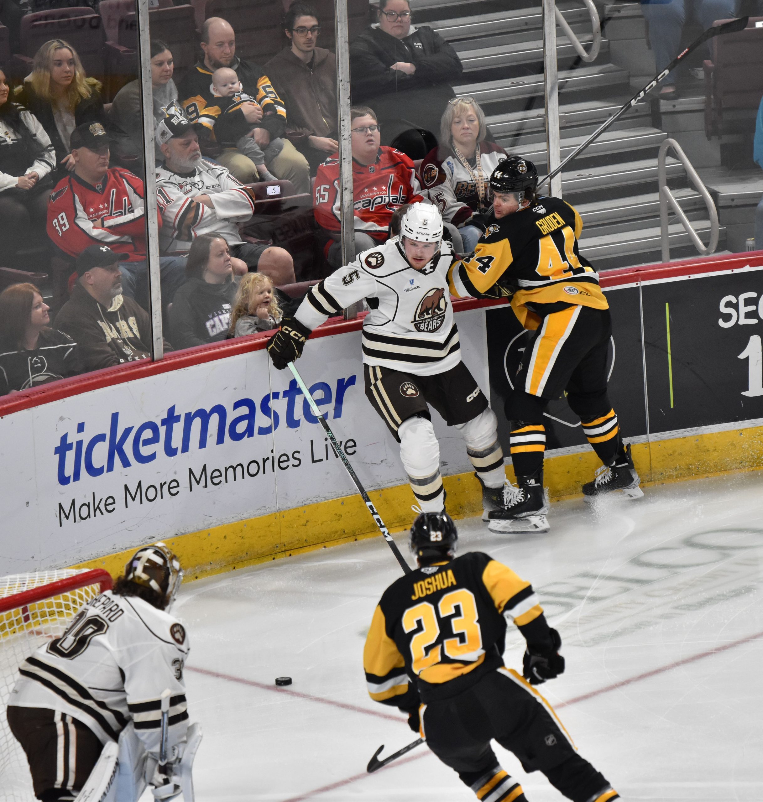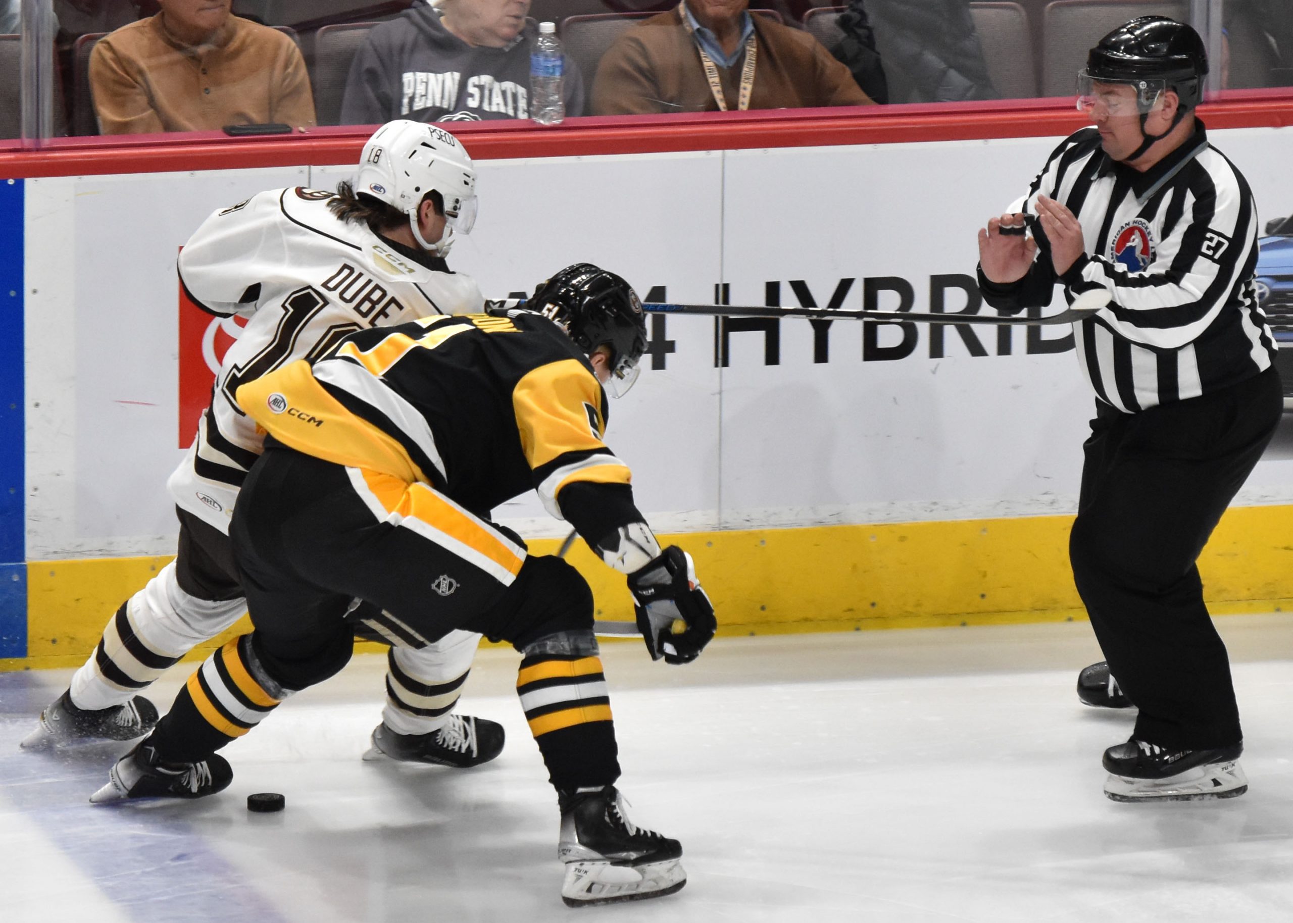 Minutes later Corey Andonovski checked Limoges from behind along the glass at 13:05, prompting Pierrick Dube to respond and scrap with Andonovski. A slashing penalty to the Penguins’ Colin White at 13:30 then resulted in a 4-on-3 man advantage for Hershey.