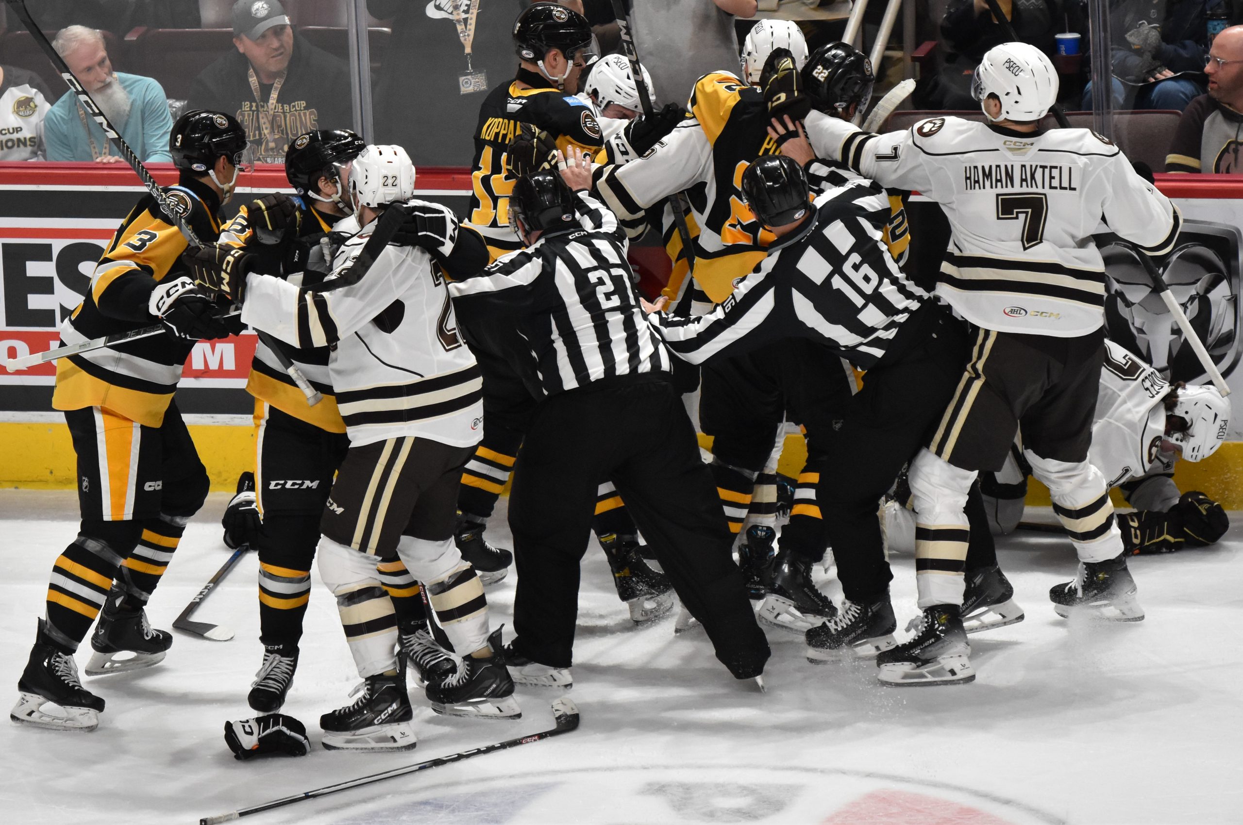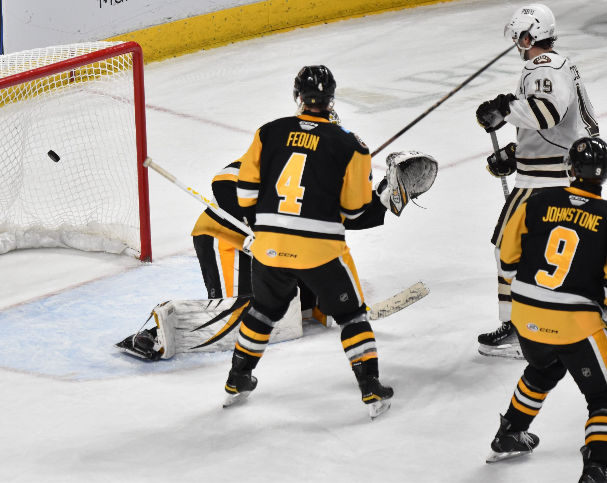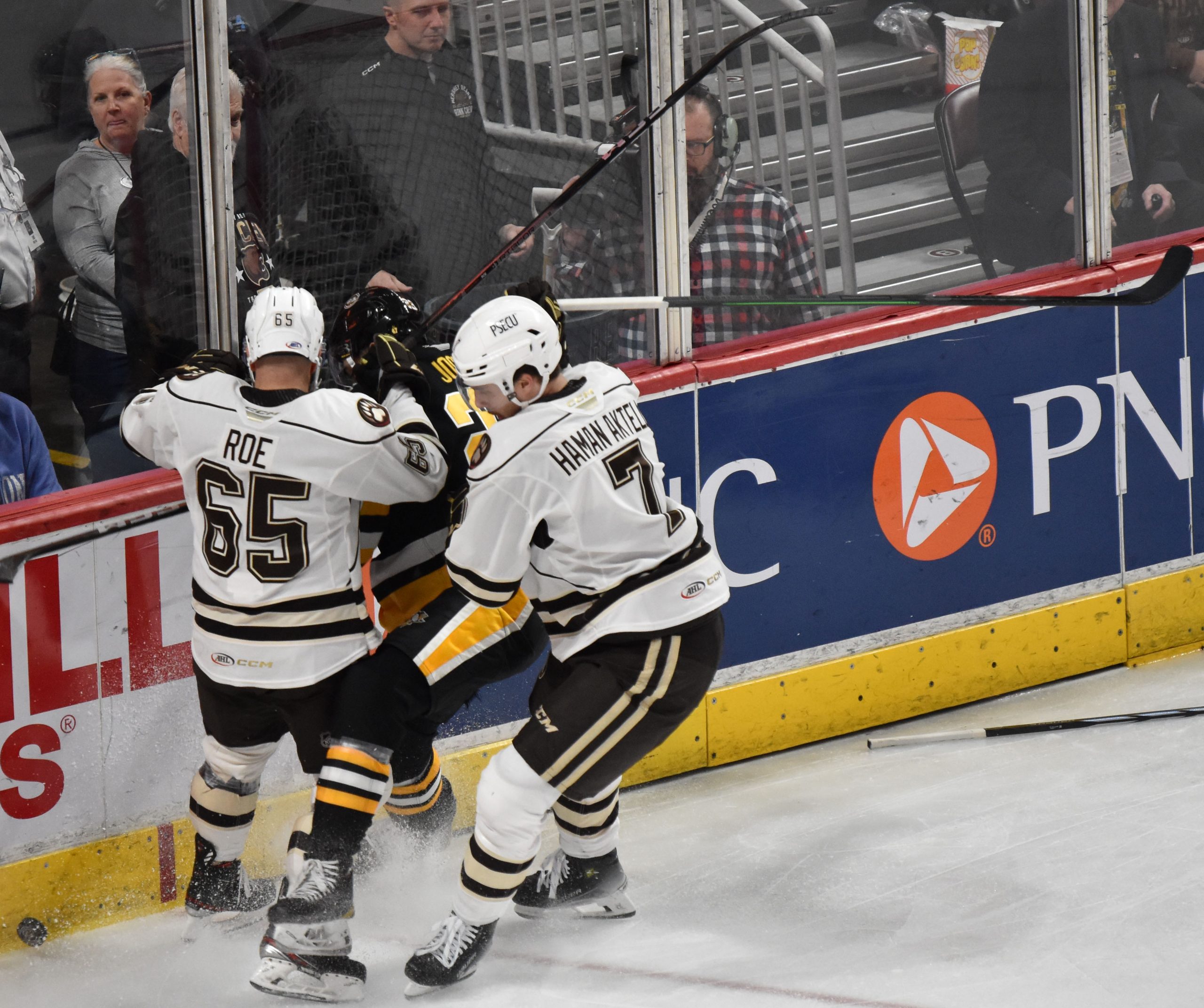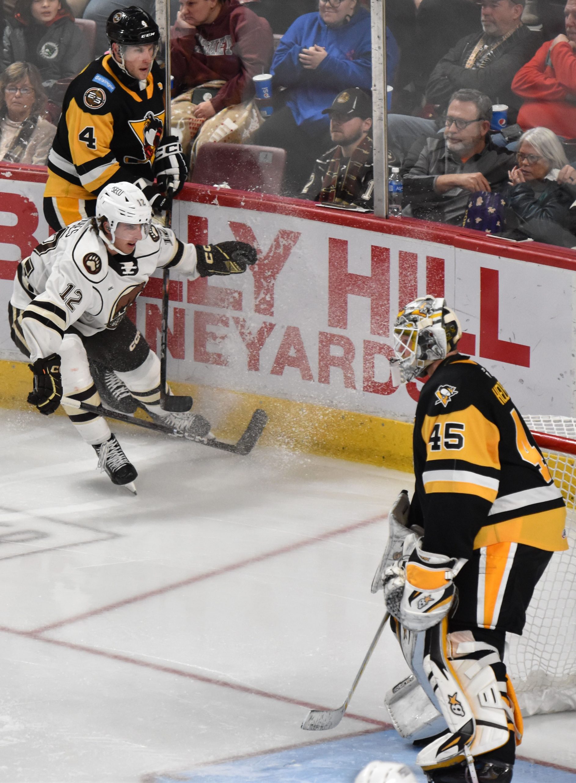 Minutes later Corey Andonovski checked Limoges from behind along the glass at 13:05, prompting Pierrick Dube to respond and scrap with Andonovski. A slashing penalty to the Penguins’ Colin White at 13:30 then resulted in a 4-on-3 man advantage for Hershey.