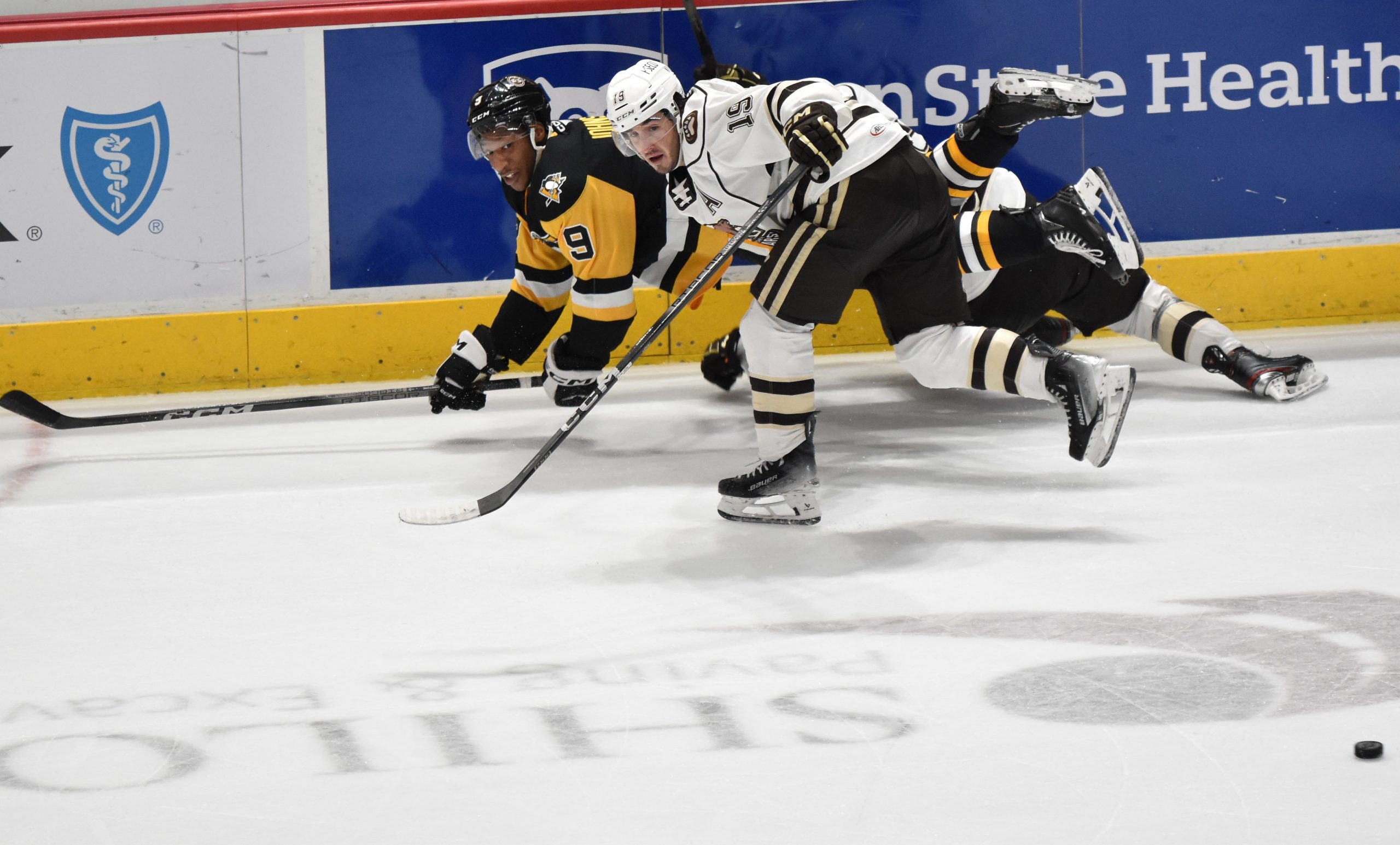 Minutes later Corey Andonovski checked Limoges from behind along the glass at 13:05, prompting Pierrick Dube to respond and scrap with Andonovski. A slashing penalty to the Penguins’ Colin White at 13:30 then resulted in a 4-on-3 man advantage for Hershey.