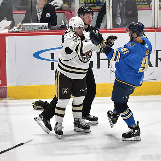 Prior to the game, the Bears honored former forward and alternate captain Chris Bourque with a jersey retirement ceremony; it was the first time the Bears had retired a former player’s number since Ralph Keller was recognized on Dec. 1, 2002. In addition to Bourque’s #17 being raised to the rafters, Bourque and his family were honored with several gifts, including a commemorative hand-painted #17 jersey produced by Mark Kannell Fine Art, depicting Bourque raising the Calder Cup in 2010, and a customized five-pound Hershey’s Milk Chocolate Bar.