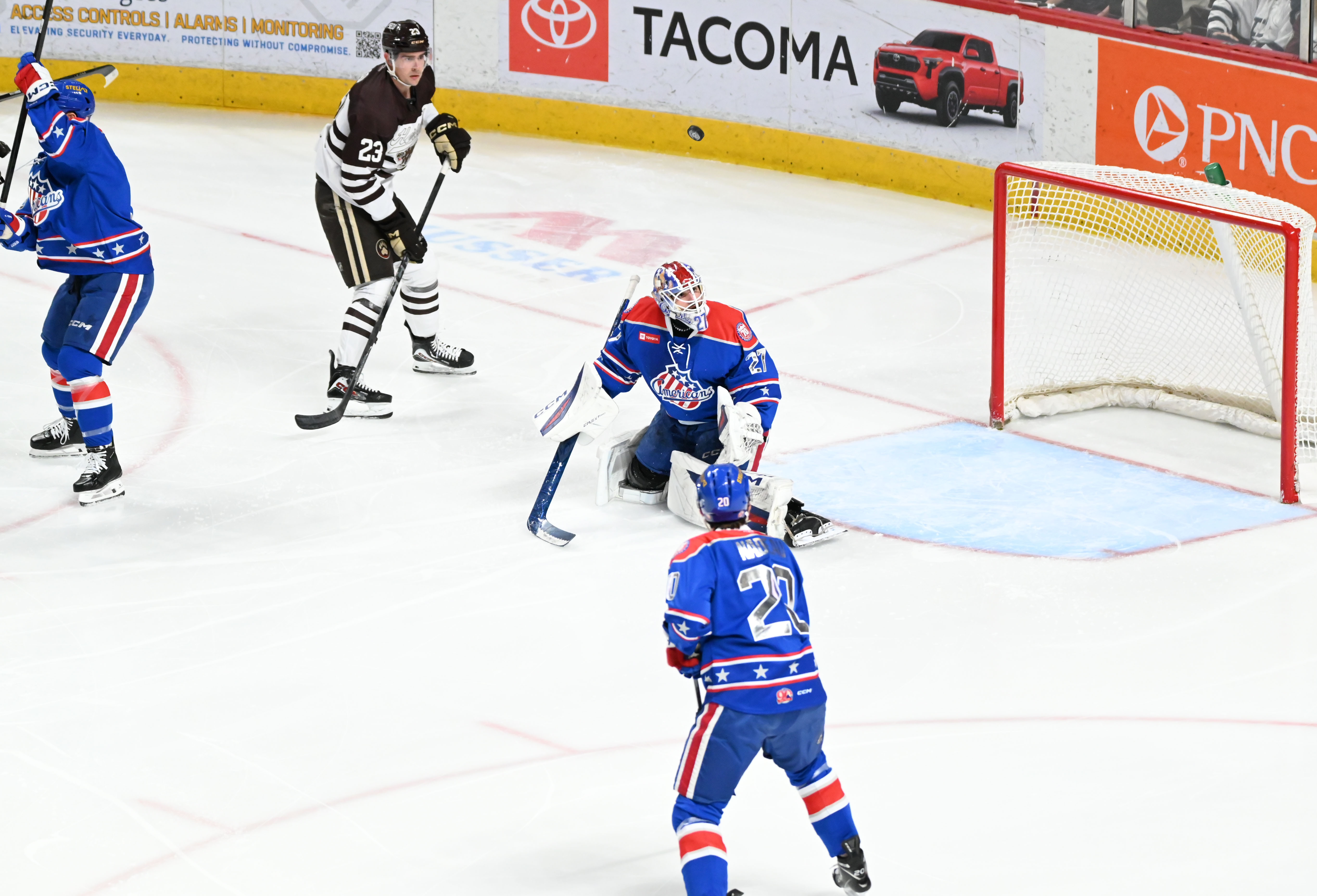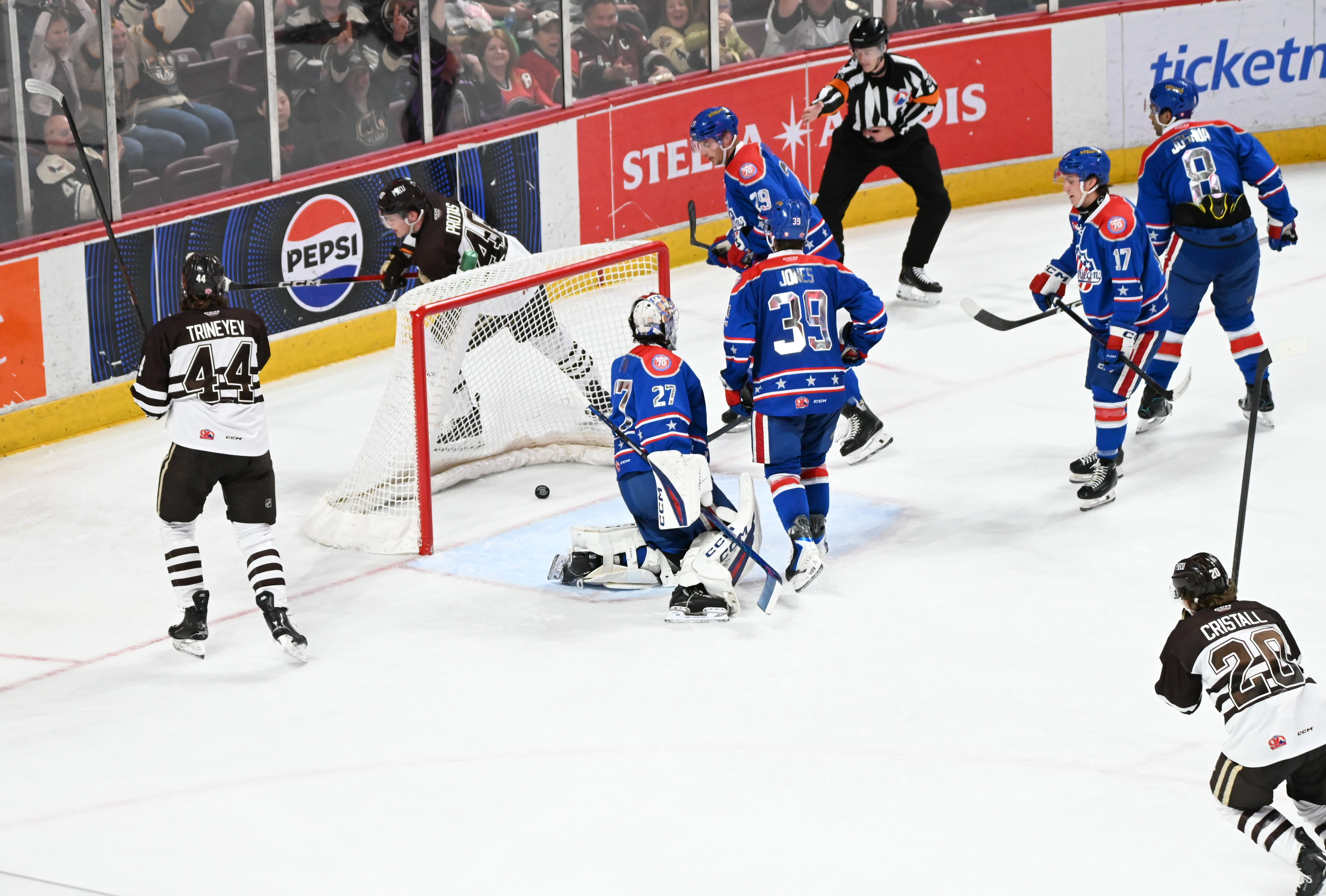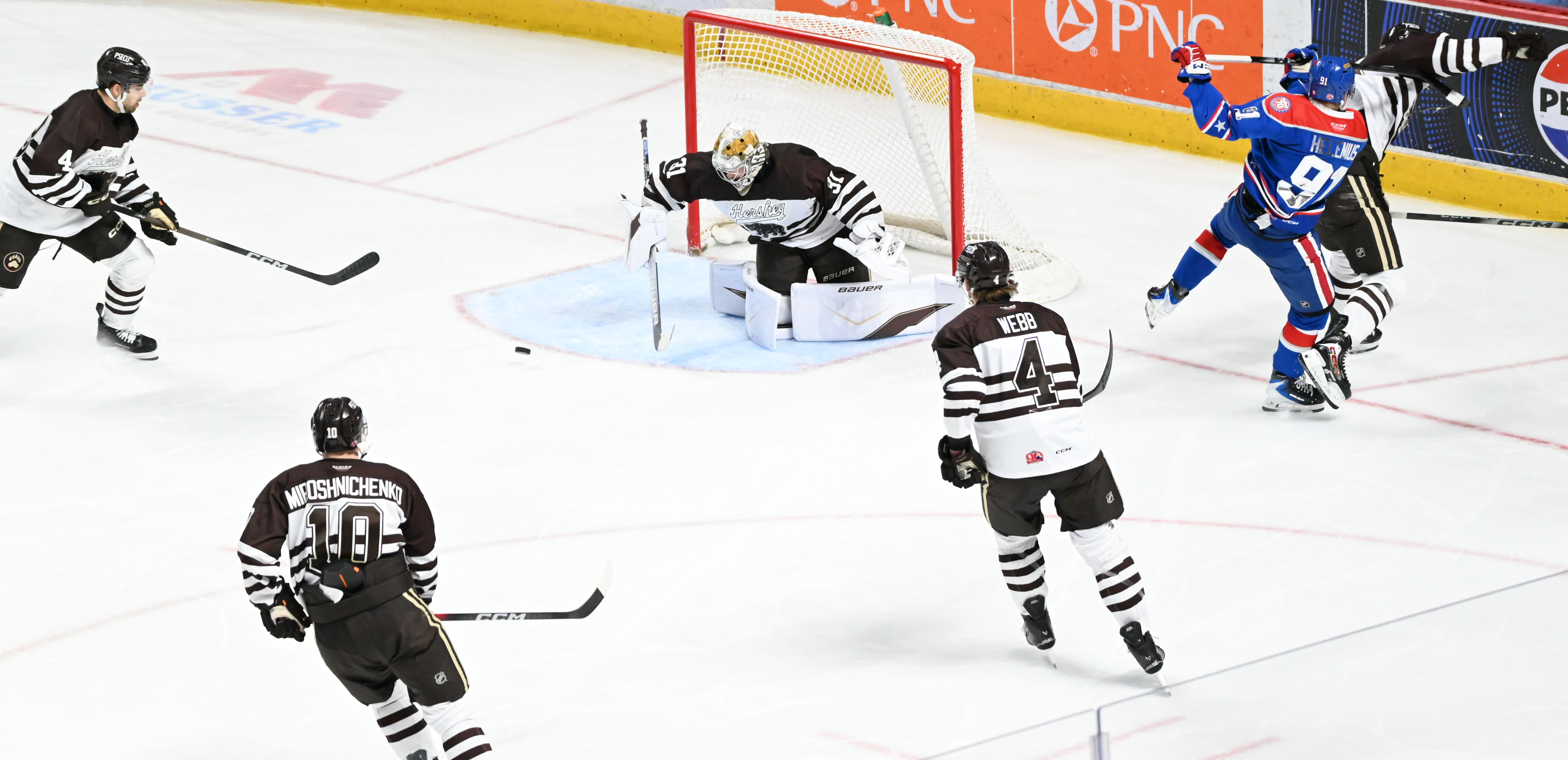 - Ilya Protas scored on a later power play at 13:37 to give Hershey a 2-1 edge with his 29th of the season from Trineyev and Andrew Cristall, but Rochester’s Konsta Helenius answered 29 seconds later to knot the game at 2-2, and Jake Leschyshyn gave the Amerks a 3-2 lead at 3:16 of the third period.