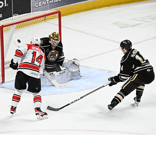 Aaron Ness tied the game for Hershey at 19:46 when Matt Strome darted behind the Charlotte net and found Ness at the left post, who roofed his fifth of the season past Mack Guzda.