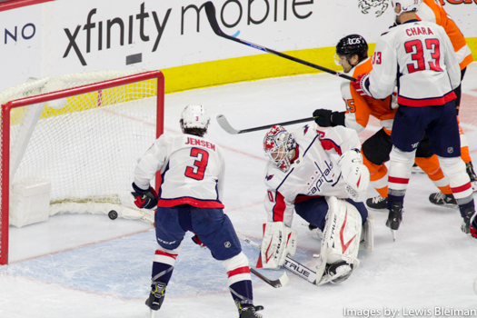 A shot by Travis Konecny #11 of the Philadelphia Flyers scores against Ilya Samsonov #30 of the Washington Capitals in the first period.