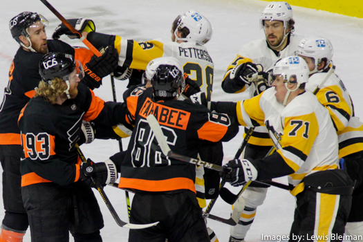 Pittsburgh Penguins players take exception to the cross check by Shayne Gostisbehere #53 of the Philadelphia Flyers on Mark Friedman #52 of the Pittsburgh Penguins in the third period.