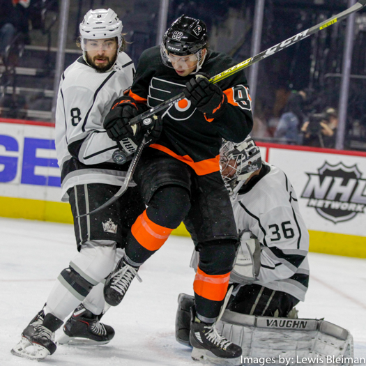 Drew Doughty #8 of the Los Angeles Kings checks Connor Bunnaman #82 of the Philadelphia Flyers as he attempts to deflect a shot past Kings Goalie Jack Campbell #36