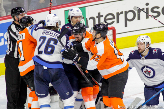 Winnipeg Jets players take exception to Philadelphia Flyers Kevin Hayes #13 taking a poke at the puck being covered by Jets Goalie Connor Hellebuyck #37