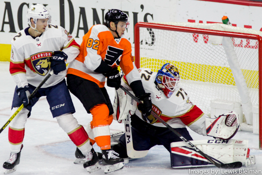 Defenseman Josh Brown #2 of the Florida Panthers attempts to keep Philadelphia Flyers Connor Bunnaman #82 from the puck in front of Goalie Sergei Bobrovsky #72 of the Florida Panthers