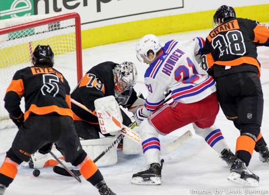 Brett Howden #21 of the New York Rangers carries the puck in on Carter Hart #79 of the Philadelphia Flyers as Philippe Myers #5 and Derek Grant #38 of the Philadelphia Flyers close in to assist their teammate.