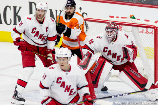 Jake Gardiner #51, Jordan Staal #11,Alex Nedeljkovic #39 of the Carolina Hurricanes and Philadelphia Flyers Nate Thompson #44 look toward the point for the incoming shot.