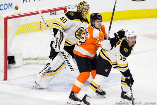 Nicolas Aube-Kubel #62 of the Philadelphia Flyers fights for position against Connor Clifton #75 in front of Goalie Tuukka Rask #40 of the Boston Bruins