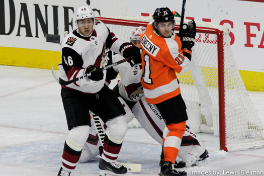 Ilya Lyubushkin #46, Goalie Darcy Kuemper #35 of the Arizona Coyotes and Travis Konecny #11 of the Philadelphia Flyers