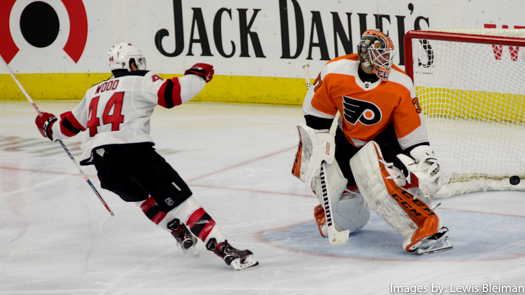 Miles Wood #44 of the New Jersey Devils scores his second goal of the night against Brian Elliott #37 of the Philadelphia Flyers