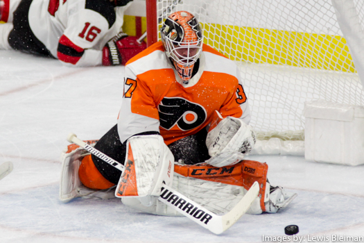Alex Lyon took the crease early in the third when the score was 4-0; faced one shot and did not make the save.