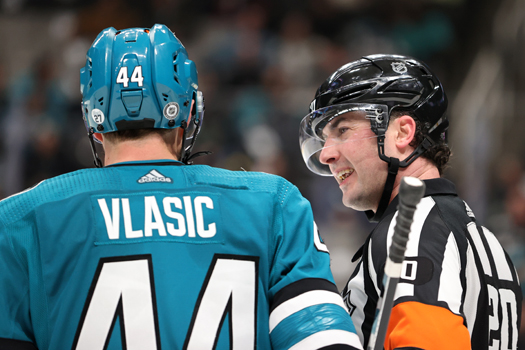 Sharks defenseman Marc-Edouard discusses a penalty call with Referee Mitch Dunning – Photo by Jack Lima