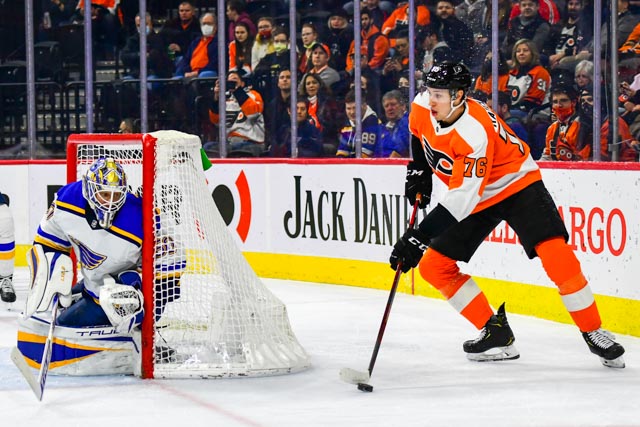 The Flyers’ Oskar Lindblom scored in the third period to tie the game. 1-1, ahead of the Blues outburst.