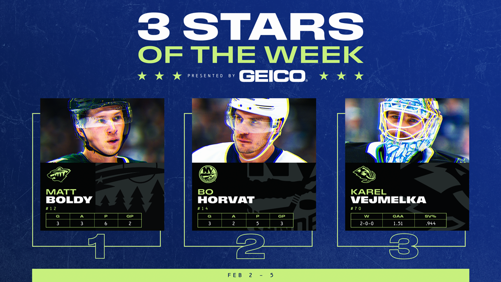 NEW YORK – Minnesota Wild left wing Matt Boldy (United States), New York Islanders center Bo Horvat (Canada) and Utah Mammoth goaltender Karel Vejmelka (Czechia) – three players who will represent their respective countries at the Olympic Winter Games Milano Cortina 2026 – have been named the NHL’s “Three Stars” presented by GEICO for the week ending Feb. 5.