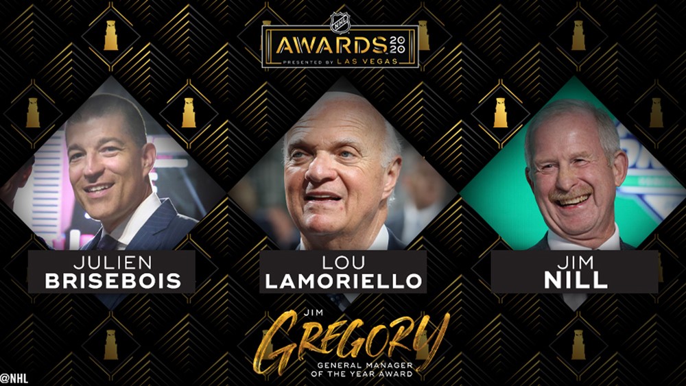 NEW YORK – Julien BriseBois of the Tampa Bay Lightning, Lou Lamoriello of the New York Islanders and Jim Nill of the Dallas Stars are the three finalists for the 2019-20 Jim Gregory General Manager of the Year Award, the National Hockey League announced today.