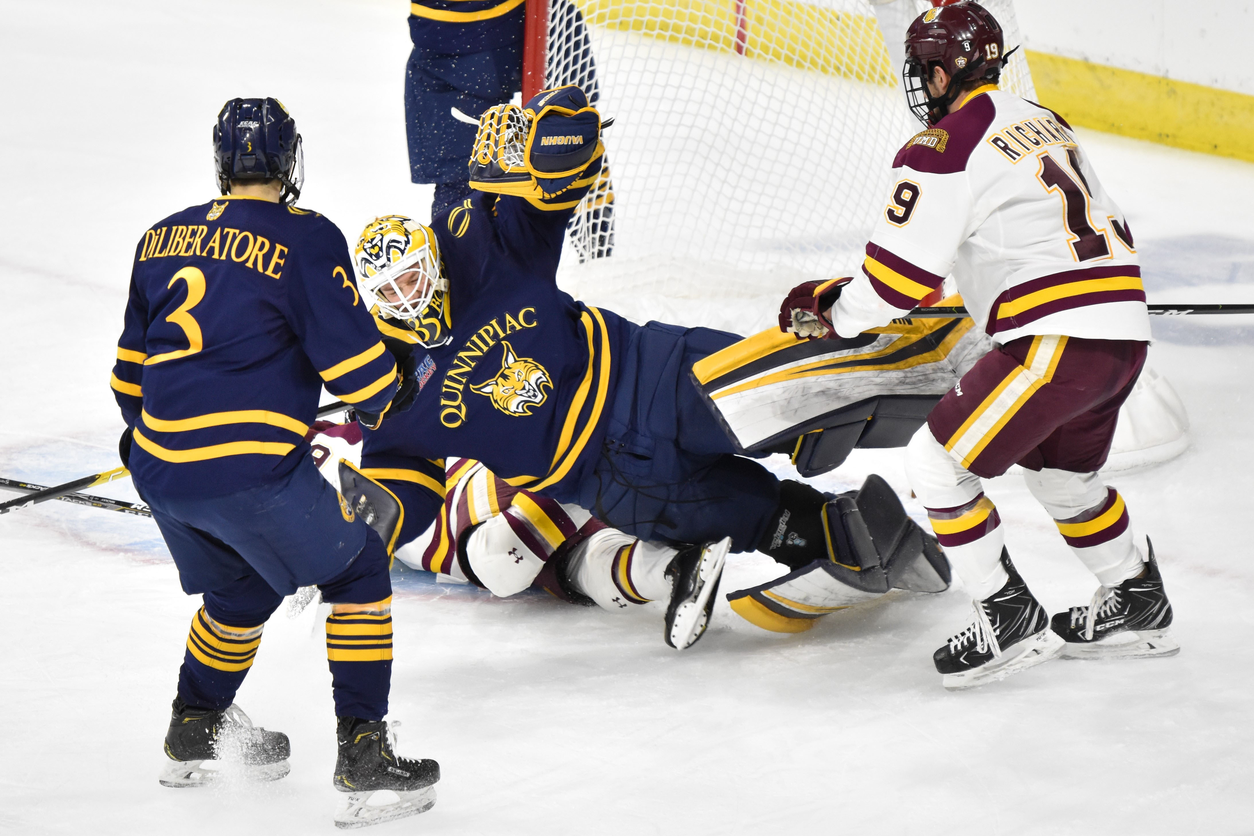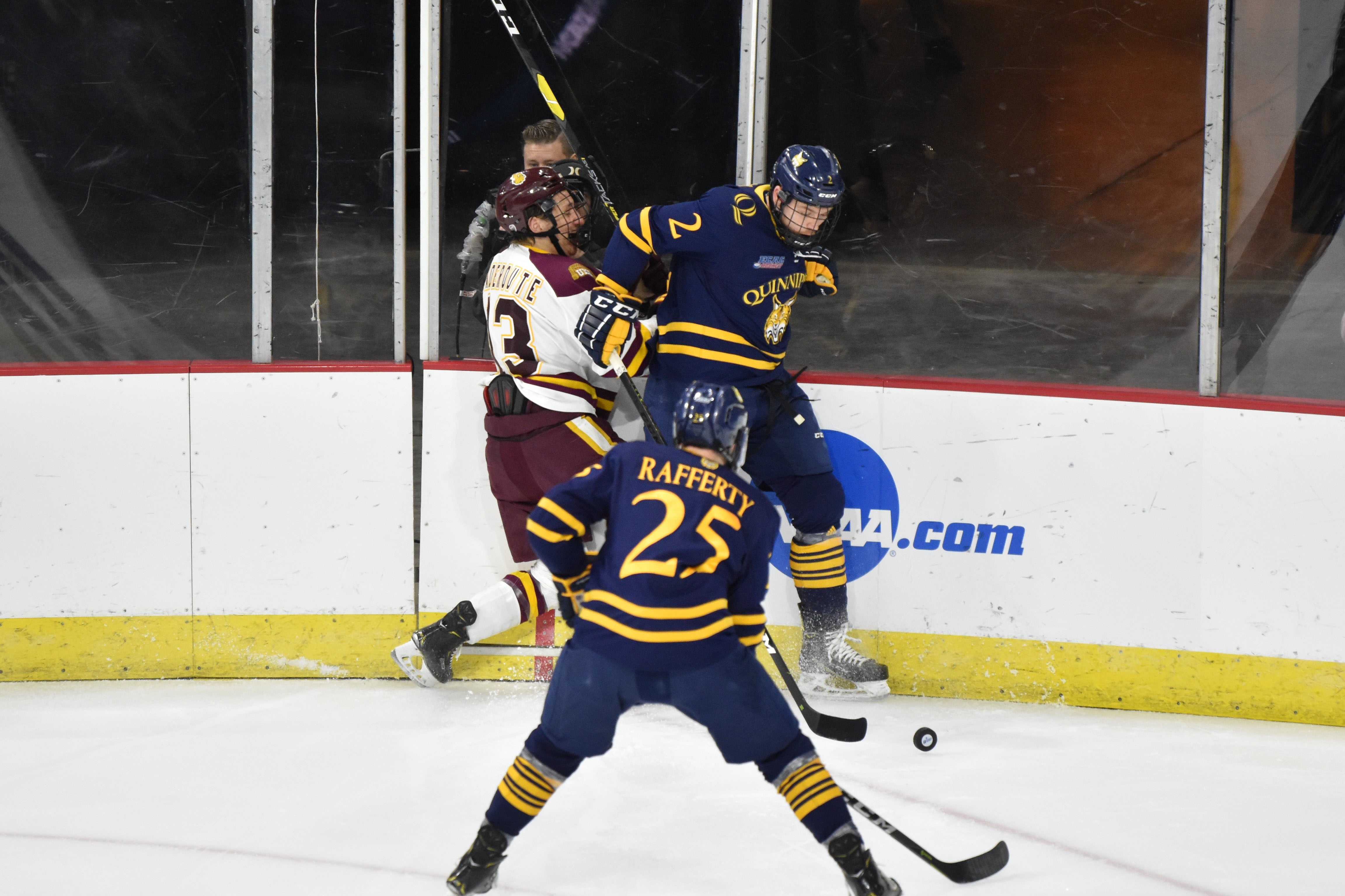 “They were impressive tonight,” Quinnipiac head coach Rand Pecknold said. “I mean, they manhandled us. Our forwards, it’s a young group. I don’t even know how many freshmen we have. It’s a lot. We just didn’t handle it well. We couldn’t find space. There’s a lot of interference out there tonight. They’re good at it, they get away with it. And we had to be tougher and battle through it better.