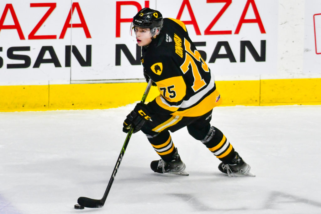 The second period saw more penalites piled on as the Bulldogs ended up with a full 2-minutes of 5-on-3 time and although they didn’t hit the back of the net with that advantage, they did before the major power-play was out. As Jorian Donovan got a quick up to the right-wing side to Logan Morrison who tossed the puck middle for Cole Brown collecting his 2nd of the season at 4:07 giving Hamilton a 4-0 lead. At 7:55 of the second frame, Ryan Humphrey was whistled for a post-whistle cross-check, and was in turn slew-footed by Sam Sedley, leading to a second Attack player being ejected from the game while the ensuing scrum saw Jorian Donovan complete a “Gordie Howe hat-trick” among 6 different penalties on the play. While the Bulldogs were on the major power-play however Owen Sound did get themselves life as Ethan Burroughs jumped on a loose puck in his defensive zone and raced in on a shorthanded breakaway, besting Matteo Drobac to cut the Hamilton lead to 4-1 at 10:24. Drobac kept things tidy the rest of the way, exited the period with the three goal lead after making a series of tremendous stops in a 4-on-3 penalty kill at the end of the second.