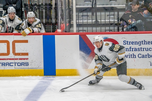 Cal Burke of the Silver Knights looks to dish out the puck to a line mate Published January 21, 2025 at 525 × 350 in Cal Burke of the Silver Knights looks to dish out the puck to a line mate