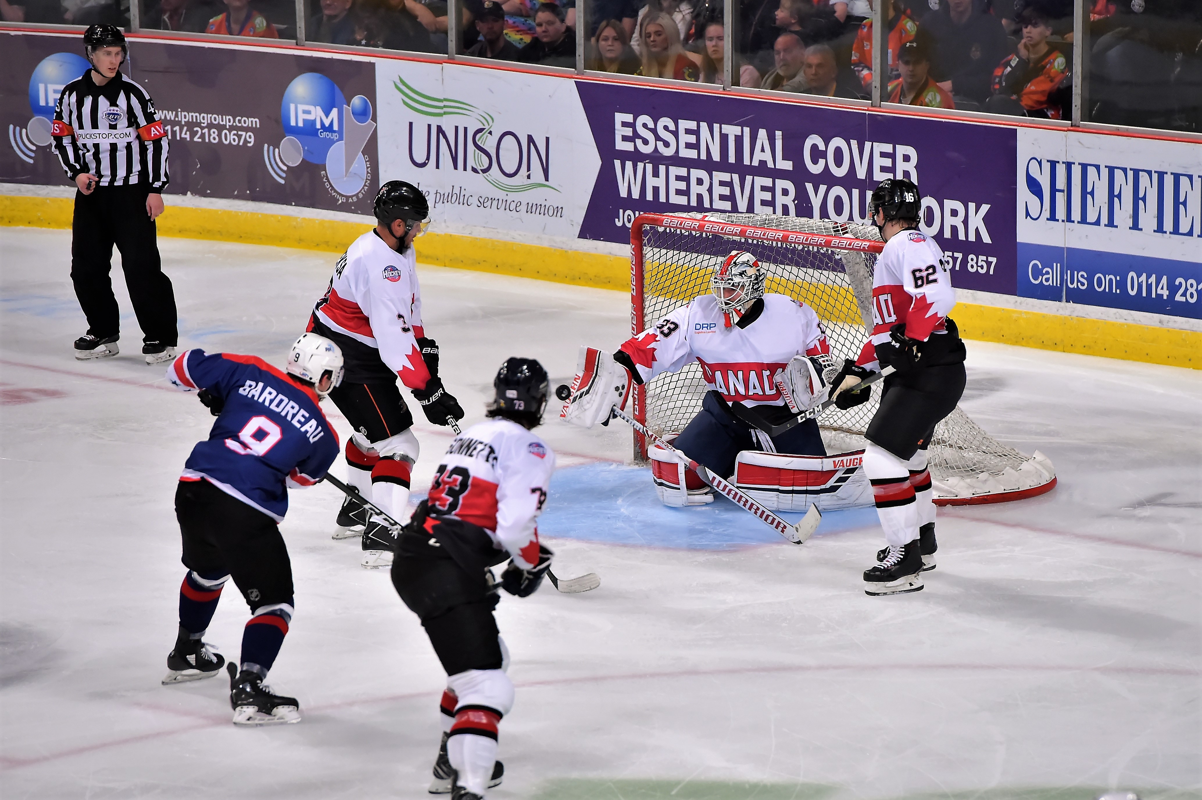 SHEFFIELD – A crowd of well over 4000 fans packed into the FlyDSA Arena in Sheffield hotly anticipating a great matchup between all-star teams from the USA and Canada all in aid of two great charities.