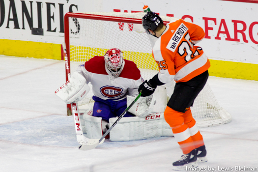 A shot byJames van Riemsdyk #25 of the Philadelphia Flyers is trapped between the pads of Carey Price #31 of the Montreal Canadiens