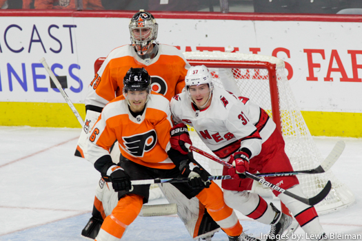 Travis Sanheim #6 of the Philadelphia Flyers battles Andrei Svechnikov #37 of the Carolina Hurricanes in front of Flyers Goalie Carter Hart #79