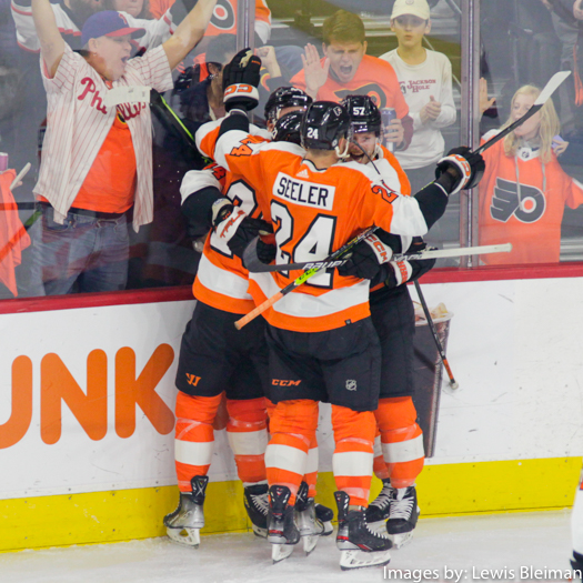 /Philadelphia Flyers players surround Nicolas Deslauriers #44 of the Philadelphia Flyers to celebrate his goal in the second period.