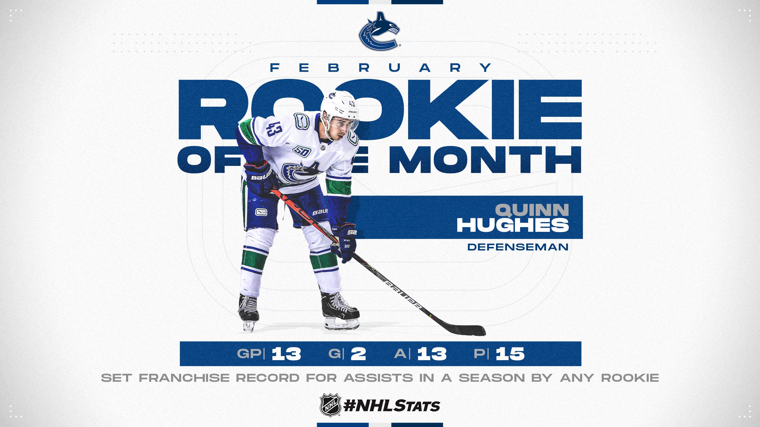 NEW YORK – Vancouver Canucks defenseman Quinn Hughes, who led all rookies for the month with 15 points (2-13—15 in 13 GP) and shared the overall NHL lead with 13 assists, has been named the NHL’s “Rookie of the Month” for February.