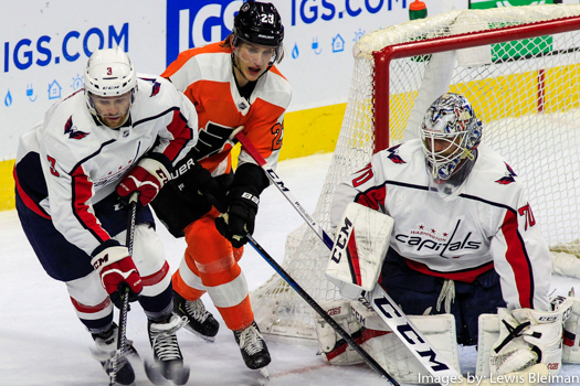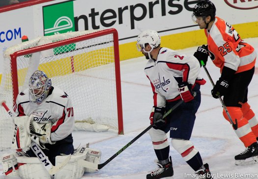 Goalie Braden Holtby (#70), Defenseman Matt Niskanen (#2) of the Washington Capitals, and Left Wing James van Riemsdyk (#25) of the Philadelphia Flyers