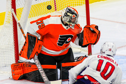 Right Wing Brett Connolly (#10) of the Washington Capitals scores his second goal of the night against Goalie Carter Hart (#79) of the Philadelphia Flyers