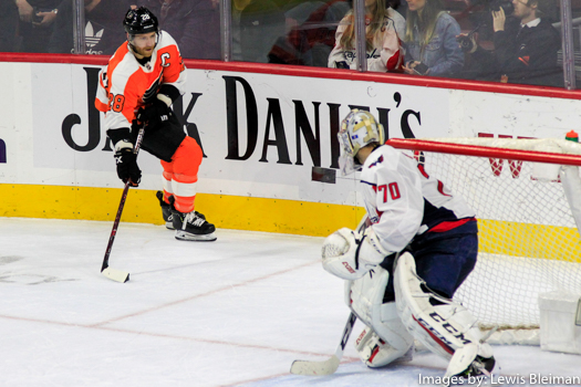 Center Claude Giroux (#28) of the Philadelphia Flyers skates towards the net defended by Goalie Braden Holtby (#70) of the Washington Capitals