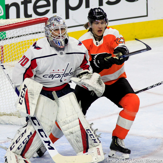Goalie Braden Holtby (#70) of the Washington Capitals and Left Wing Oskar Lindblom (#23) of the Philadelphia Flyers