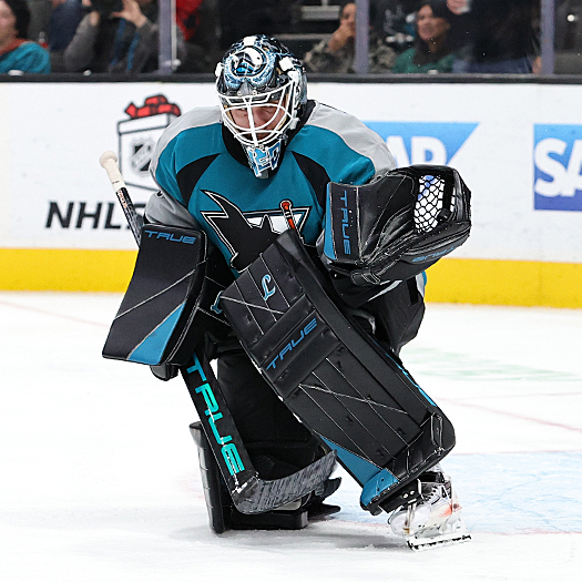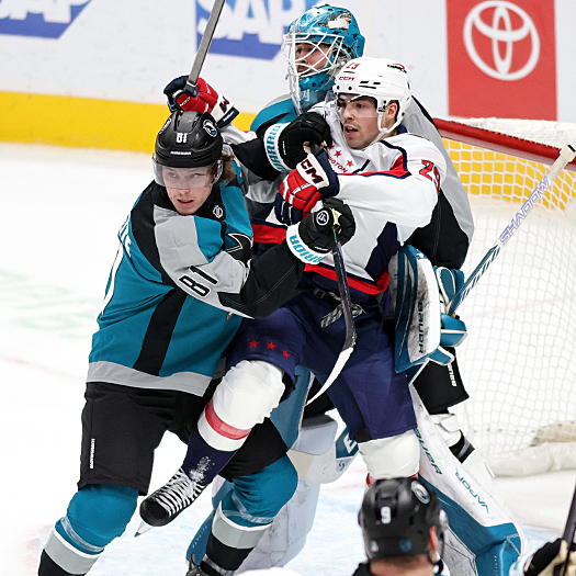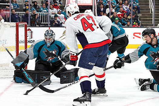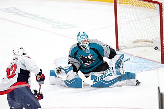 Sharks goalie Yaroslav Askarov blocks a shot from Capitals forward Anthony Beauvillier (72) – Photo by Jack Lima