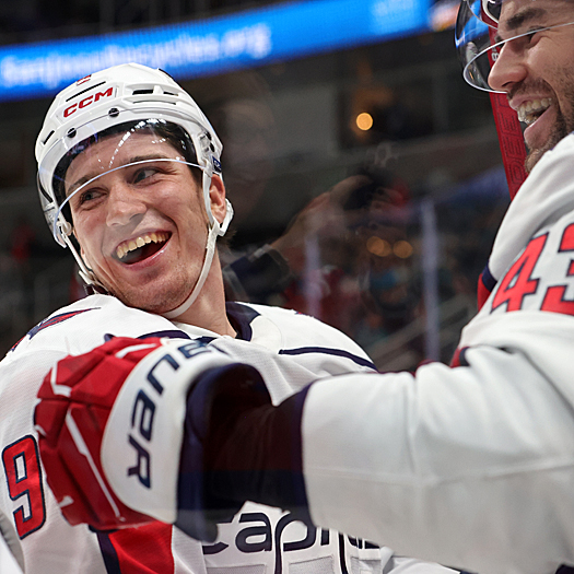 Capitals forward Ryan Leonard (9) celebrates his goal with teammate Tom Wilson (43) – Photo by Jack Lima