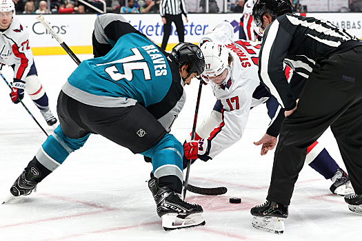 Sharks forward Ryan Reaves (75) faces off against Capitals center Dylan Strome (17) – Photo by Jack Lima