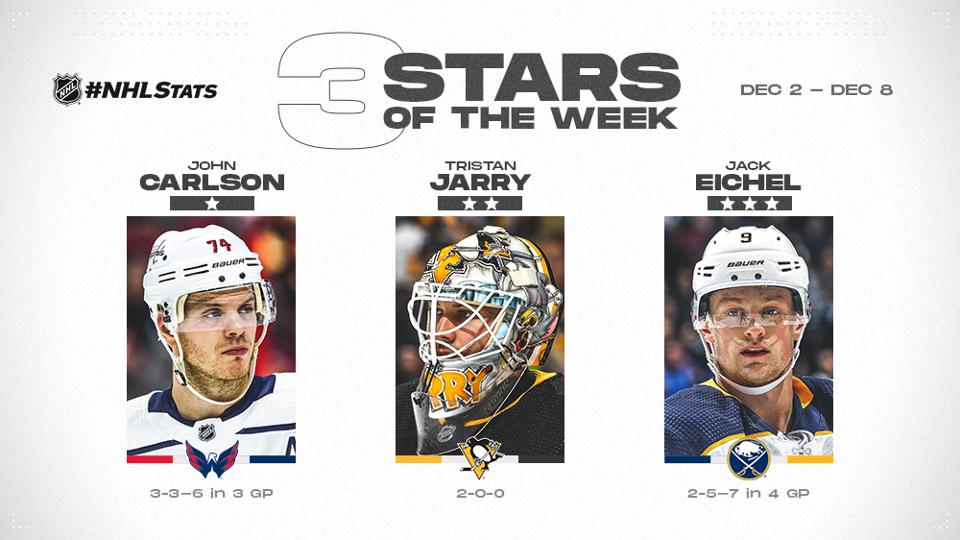 NEW YORK – Washington Capitals defenseman John Carlson, Pittsburgh Penguins goaltender Tristan Jarry and Buffalo Sabres center Jack Eichel have been named the NHL’s “Three Stars” for the week ending Dec. 8.