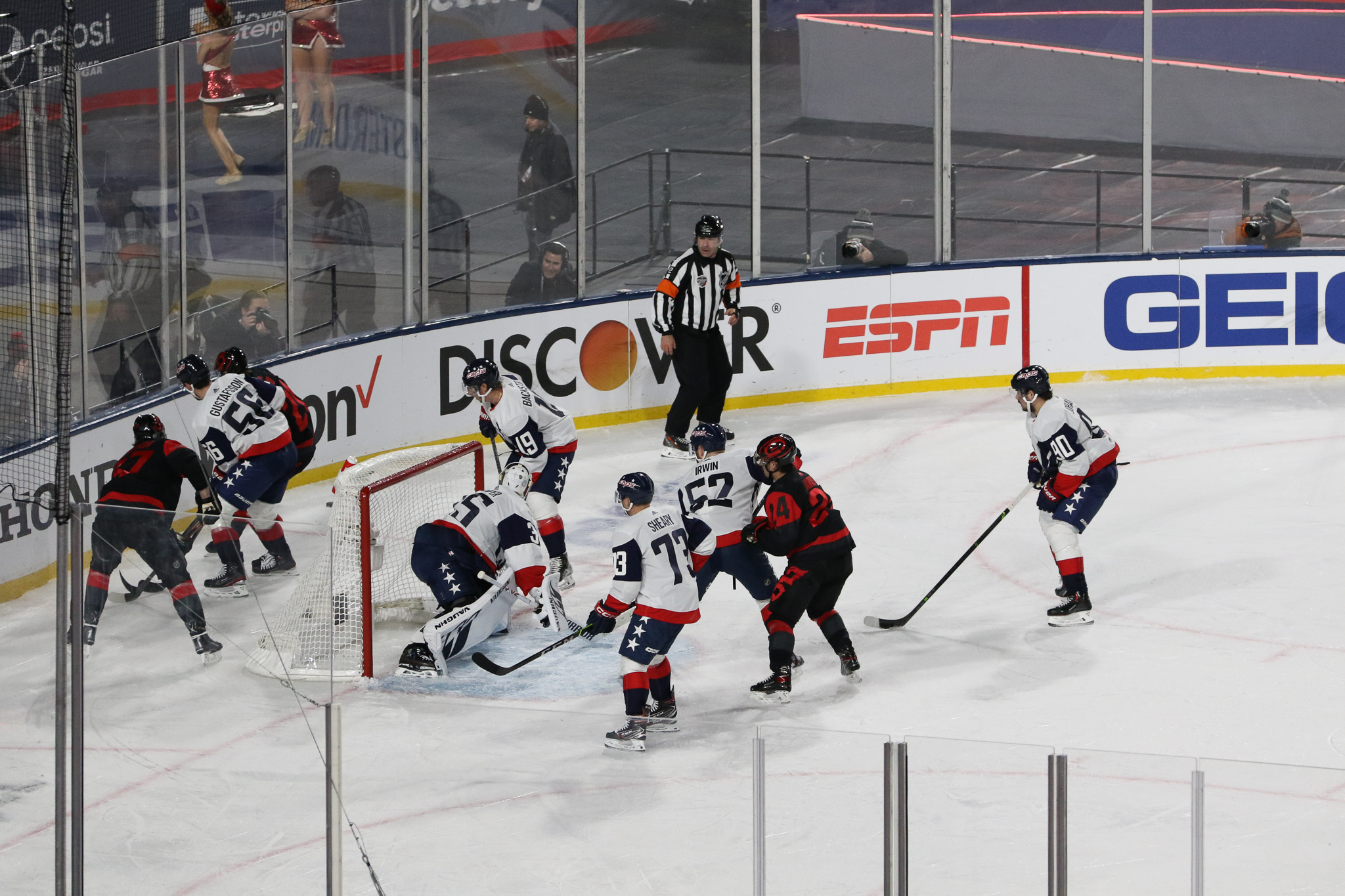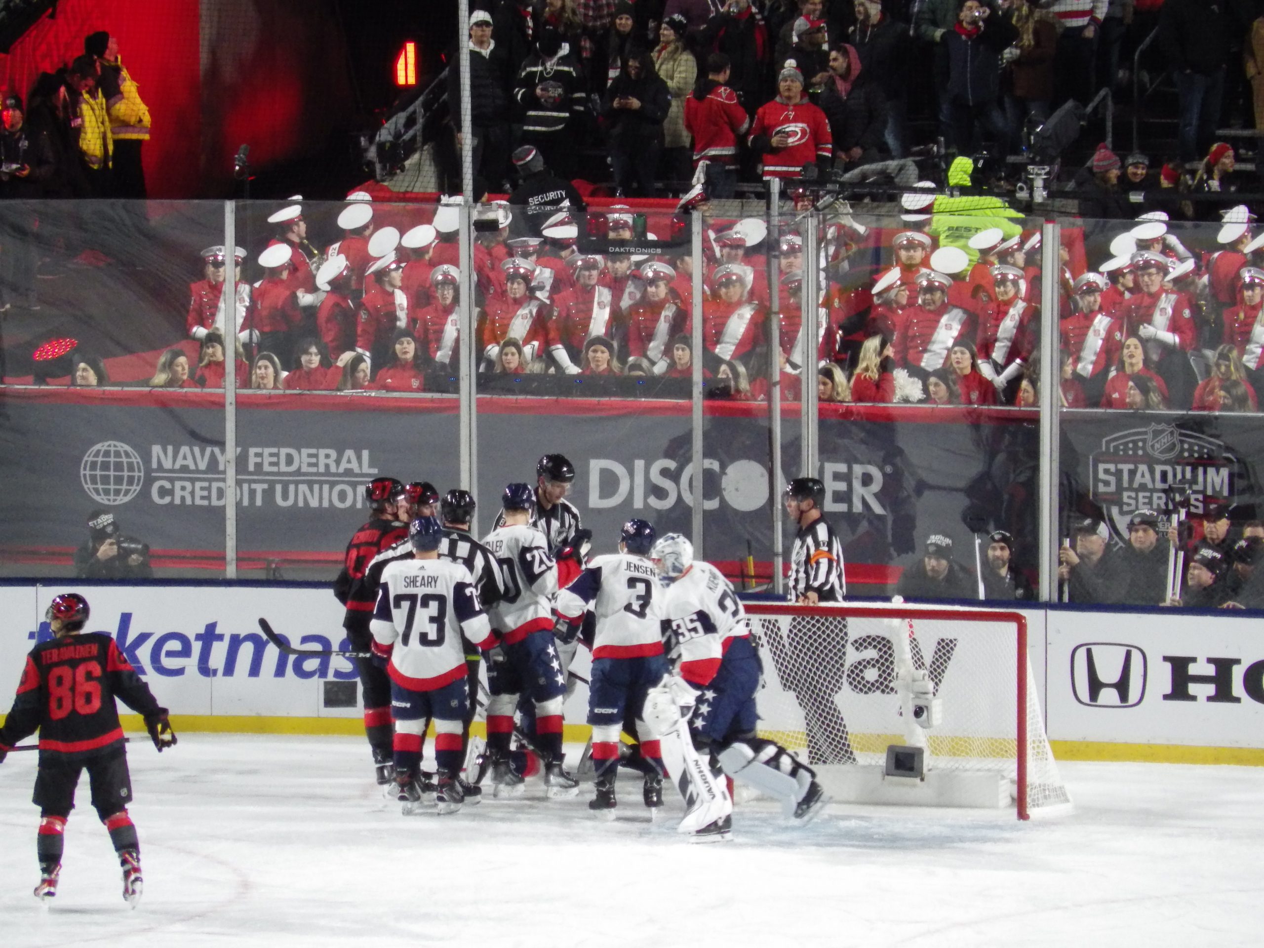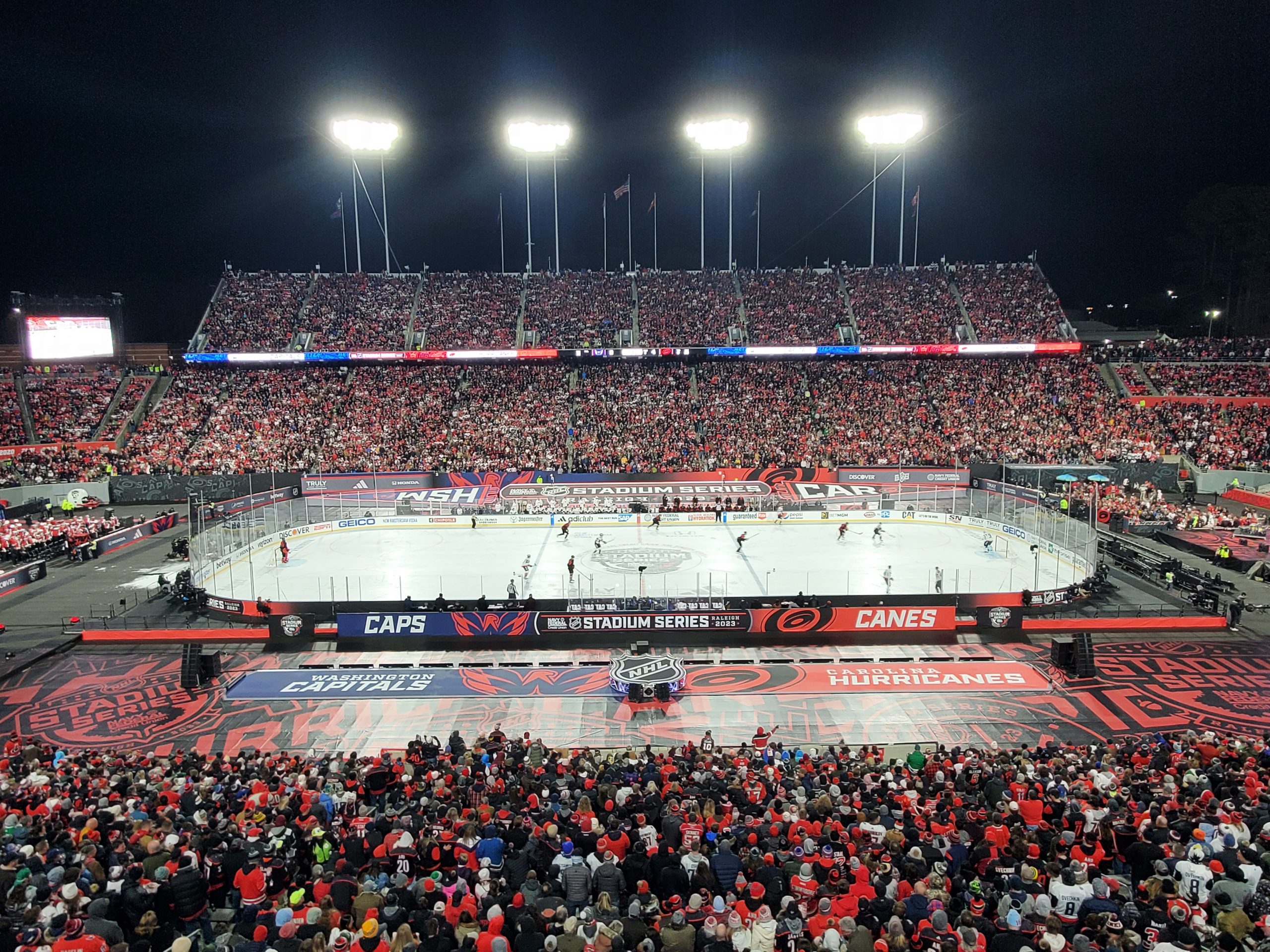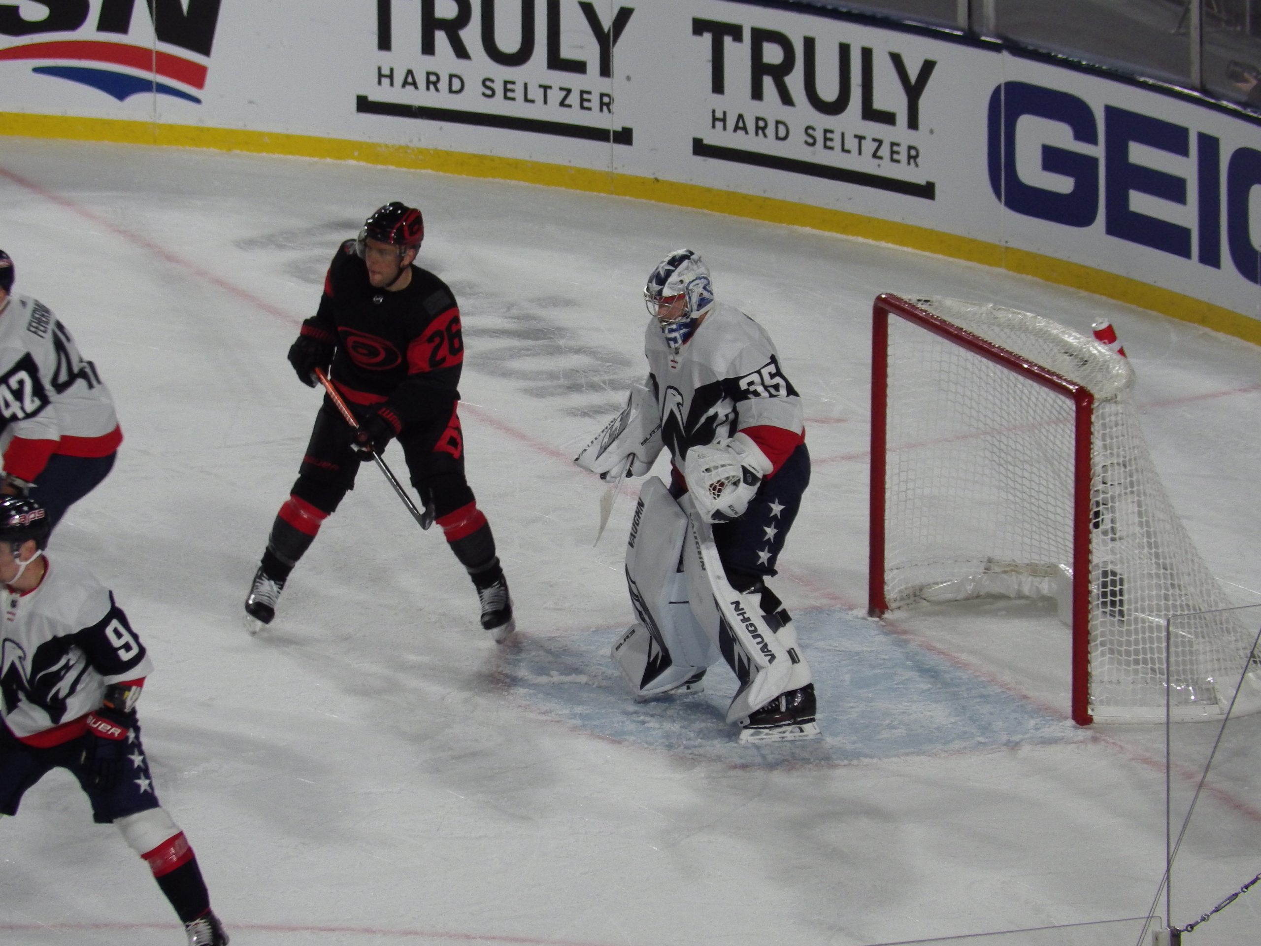 Goaltenders Frederik Andersen, a veteran of several outdoor games defended the net for Carolina at the south end while 2022 Stanley Cup champion Darcy Kuemper defended the north end, another regular season game in his maiden campaign with the Capitals.