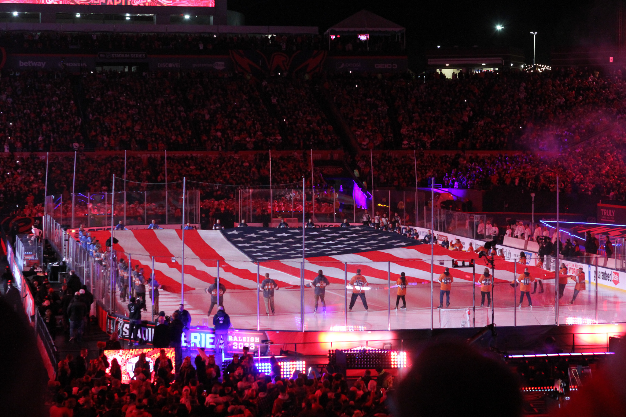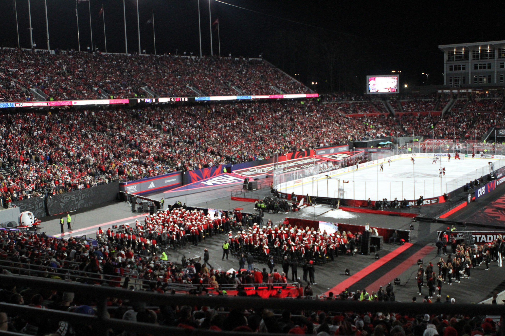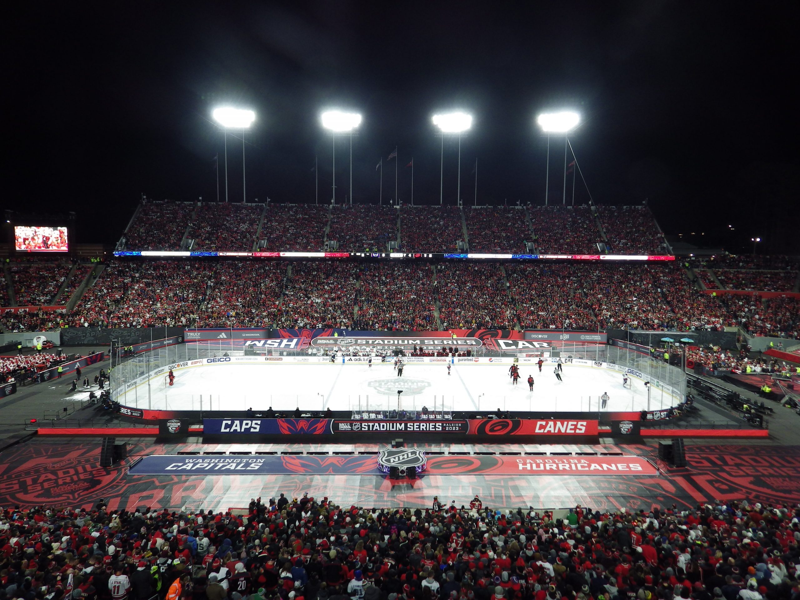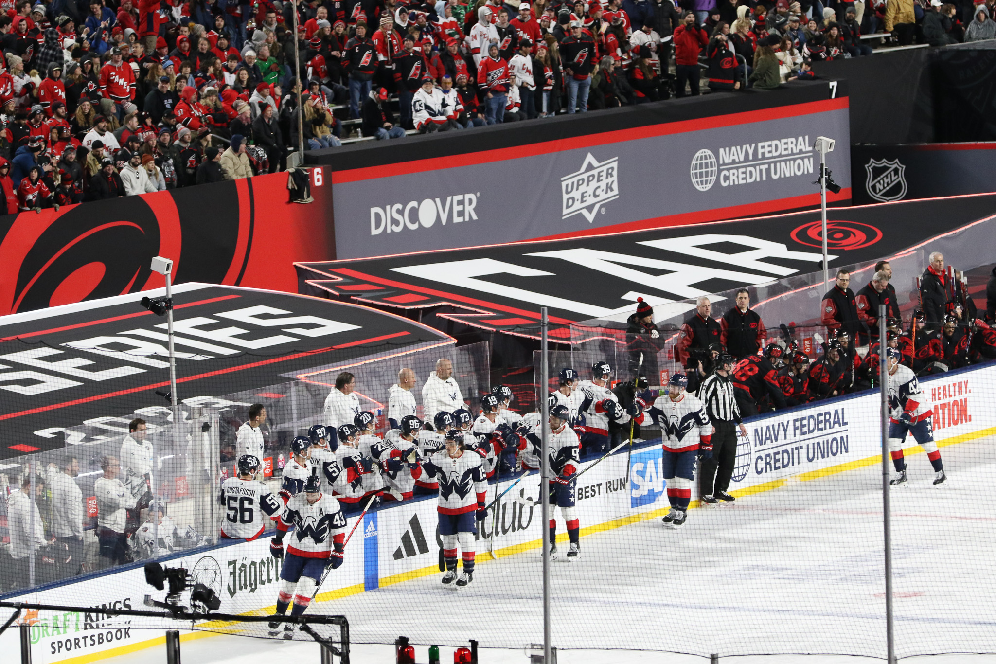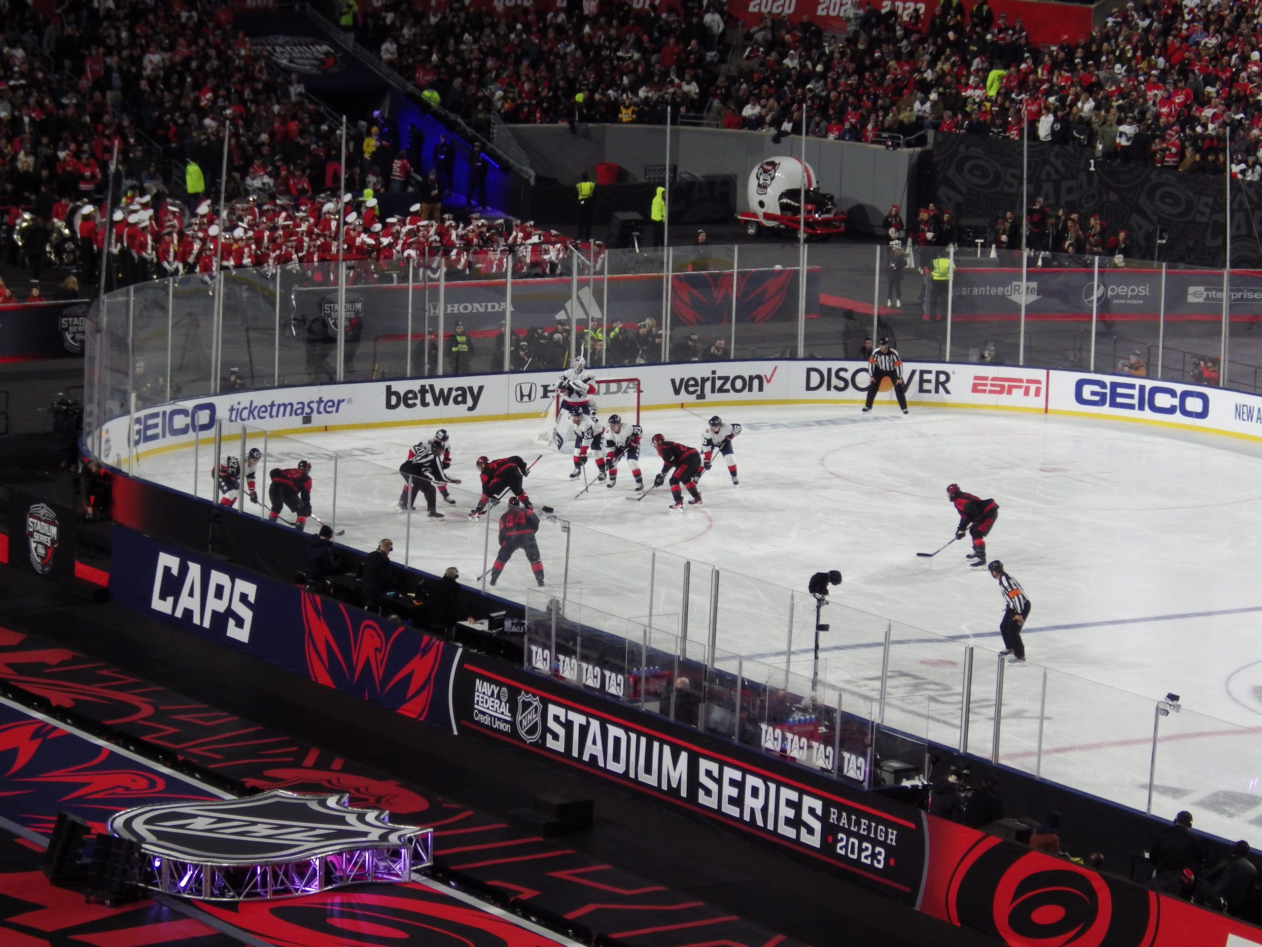 Goaltenders Frederik Andersen, a veteran of several outdoor games defended the net for Carolina at the south end while 2022 Stanley Cup champion Darcy Kuemper defended the north end, another regular season game in his maiden campaign with the Capitals.