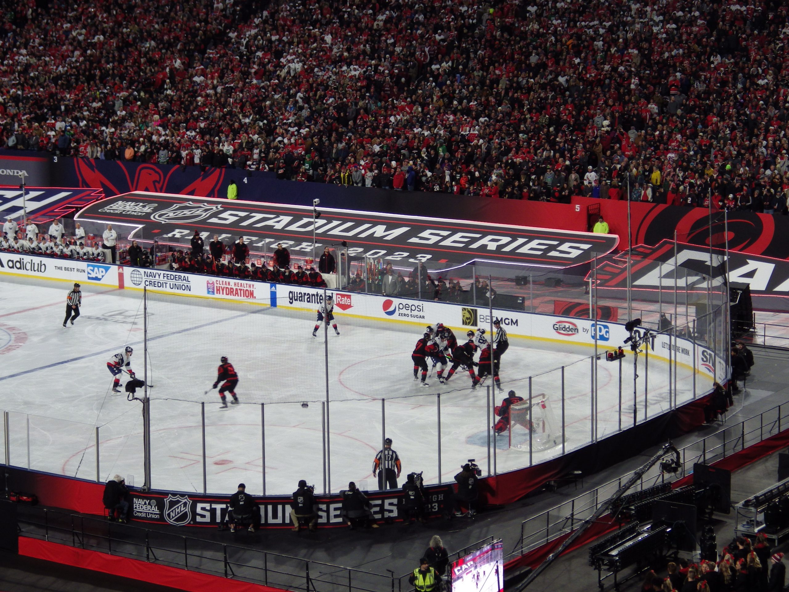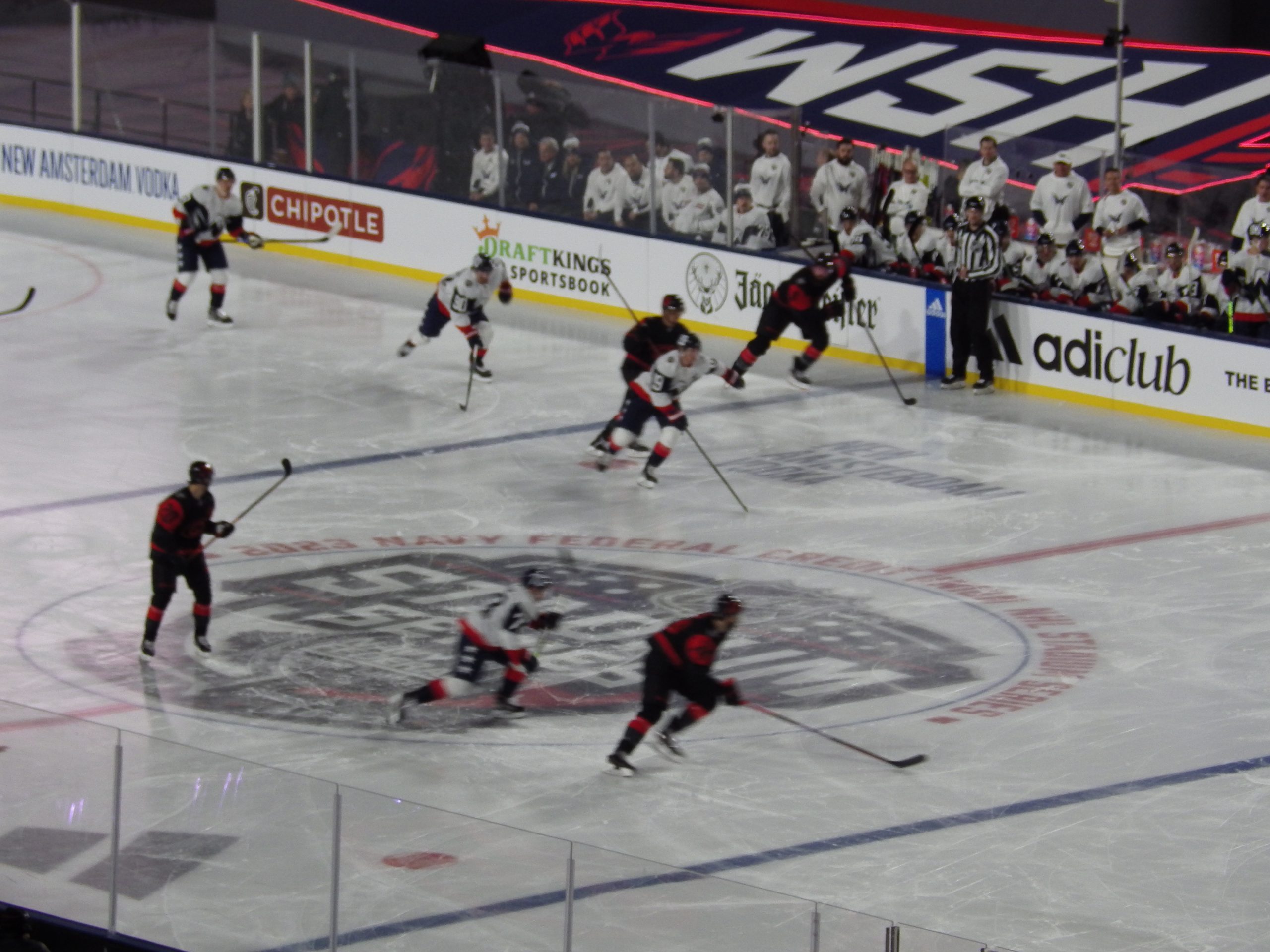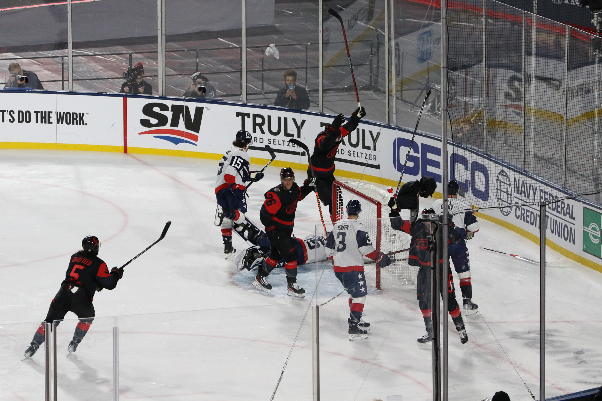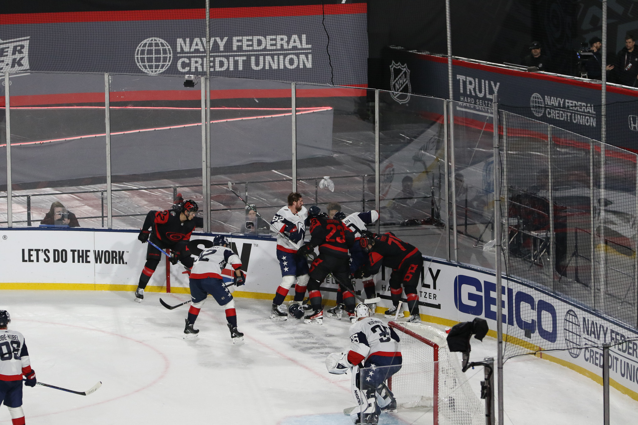 Goaltenders Frederik Andersen, a veteran of several outdoor games defended the net for Carolina at the south end while 2022 Stanley Cup champion Darcy Kuemper defended the north end, another regular season game in his maiden campaign with the Capitals.