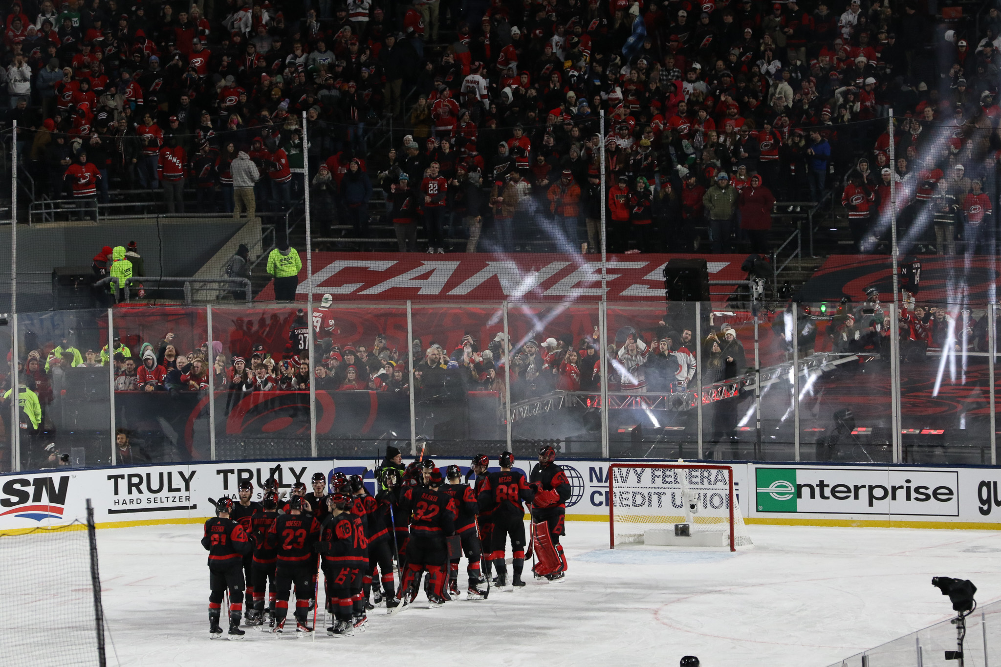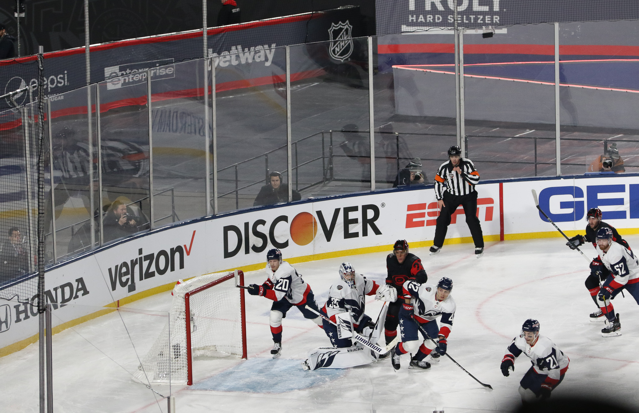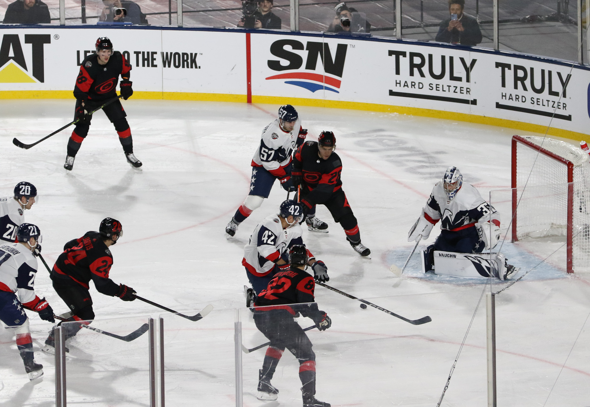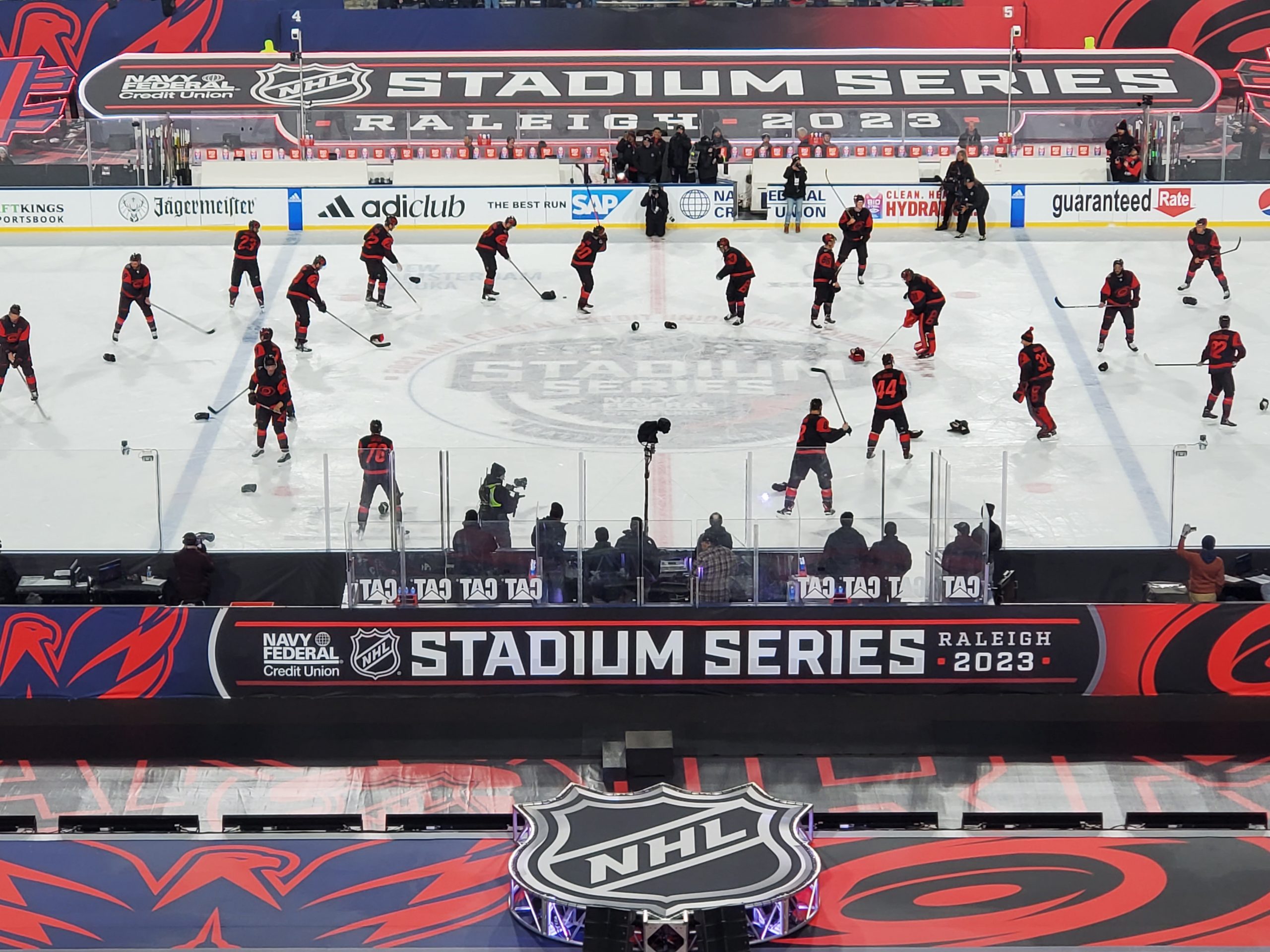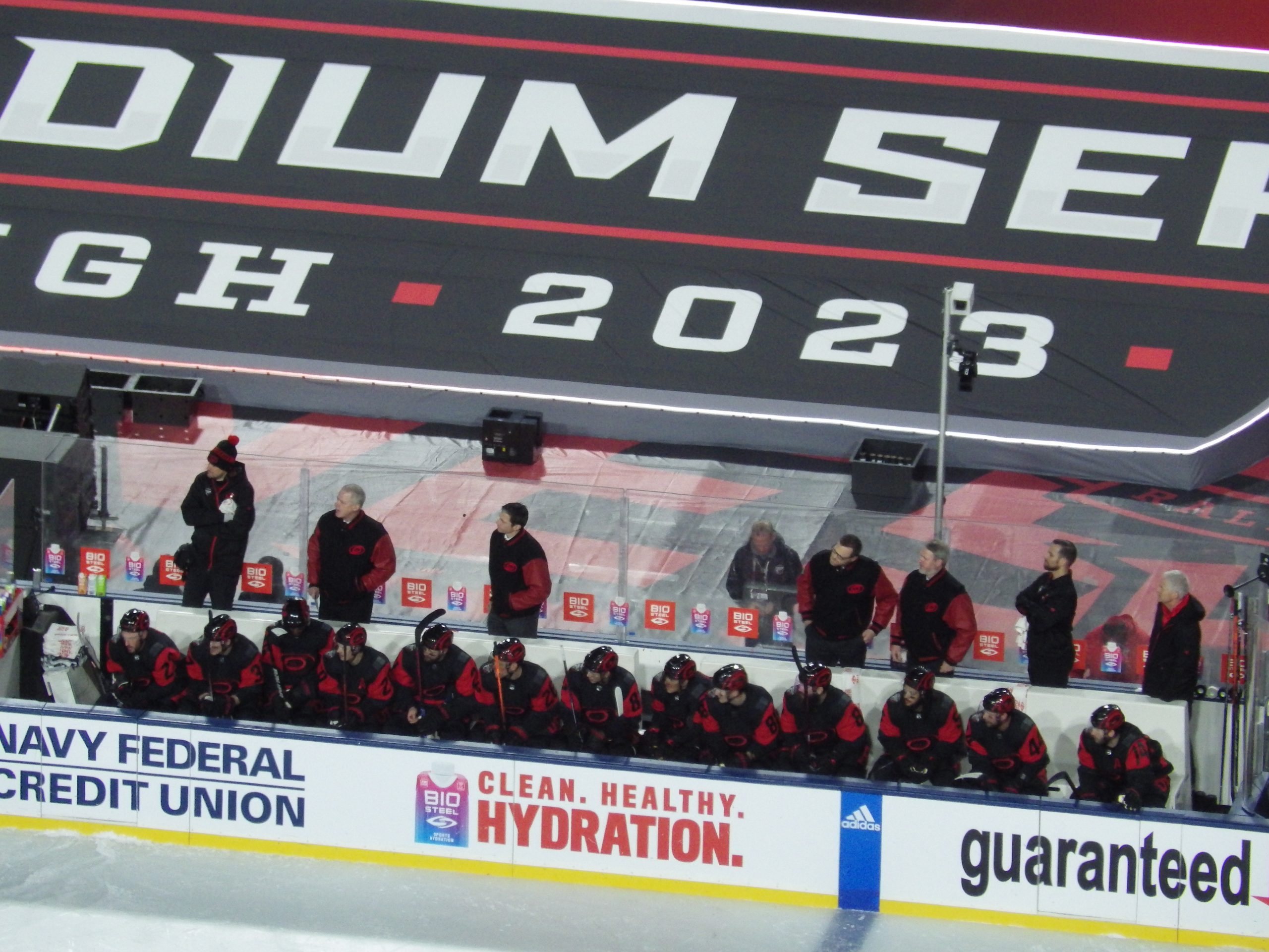 Goaltenders Frederik Andersen, a veteran of several outdoor games defended the net for Carolina at the south end while 2022 Stanley Cup champion Darcy Kuemper defended the north end, another regular season game in his maiden campaign with the Capitals.
